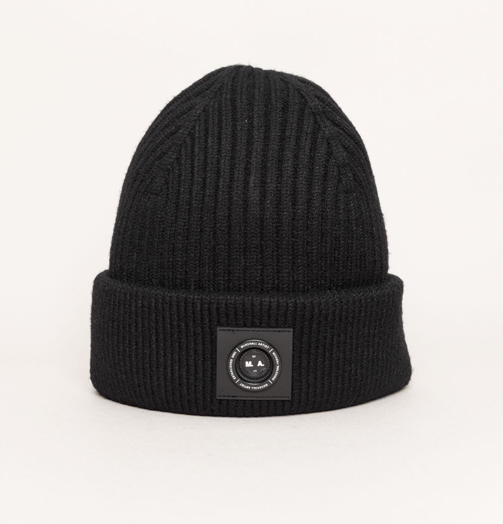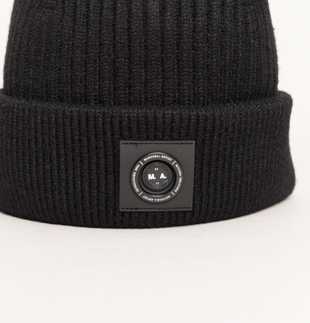 Marshall Artist Siren cable knit beanie in Black. Cotton/wool blend fabric. Chunky ribbed design. Turn up front with a Marshall Artist Siren badge. One size. 50% viscose, 30% polyester, 20% polyamide.
