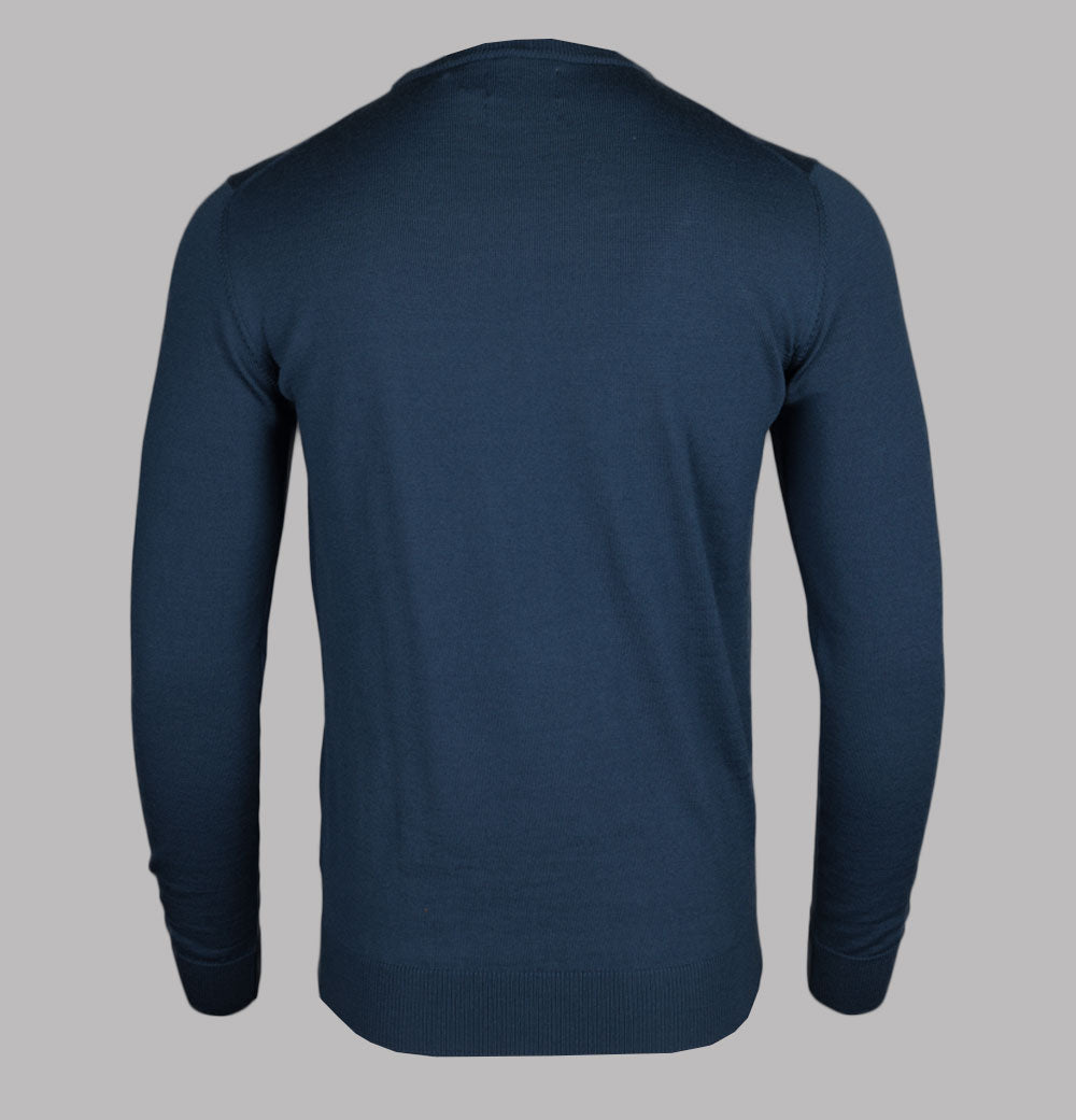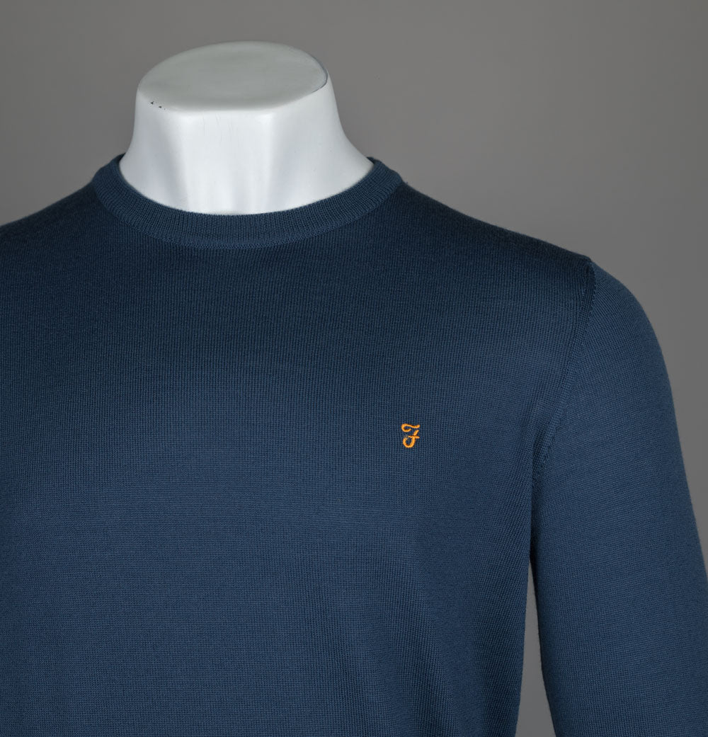 Farah Mullen crew neck merino wool sweater in Blue River. Premium merino wool fabric. Ribbed crew neck, sleeve cuffs and hem. Embroidered Farah logo on the chest. Tonal stitch detail on the shoulders. Slim fit. 100% merino wool.
