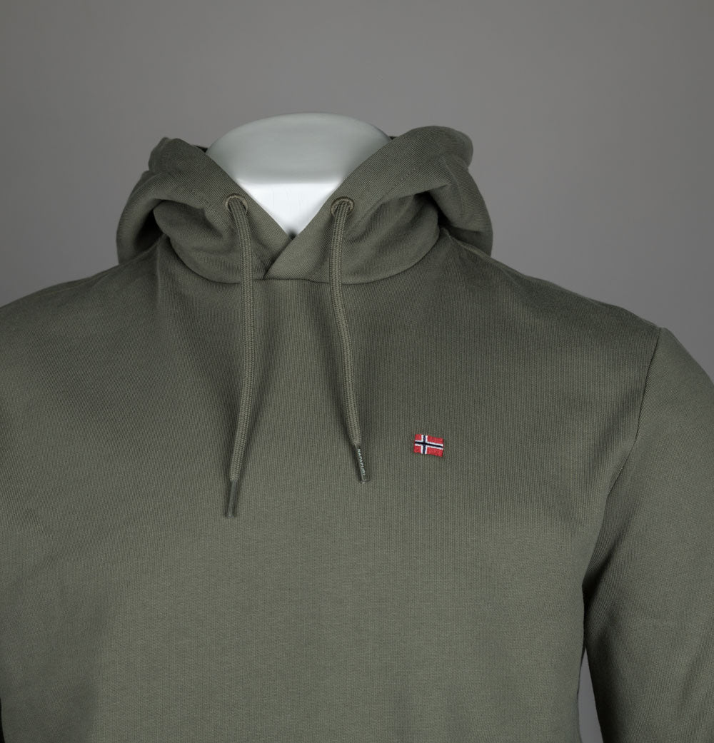 Napapijri Balis hoodie in Tea Leaf. Brushed back fleece cotton fabric. Draw cord hood. Small embroidered Norwegian flag on the chest. Ribbed sleeve cuffs and hem. Regular fit. 80% cotton, 20% polyester.
