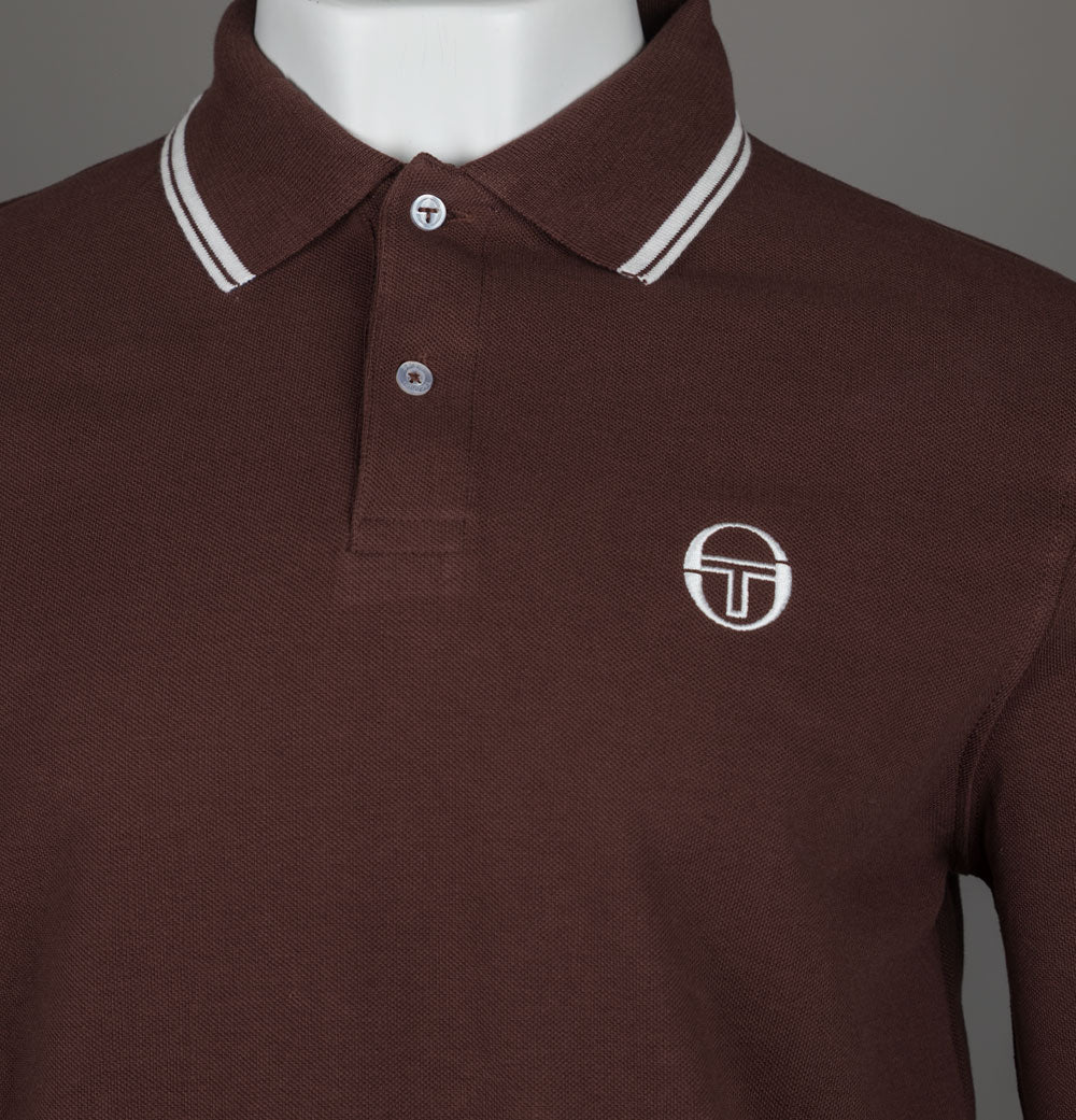 Sergio Tacchini 020 long sleeve polo shirt in Bitter Chocolate/Gardenia. Cotton pique fabric. Ribbed collar with stripe detail. Two button placket with Sergio Tacchini branded buttons. Sergio Tacchini logo on the chest. Ribbed sleeve cuffs. Slim fit. 100% cotton.