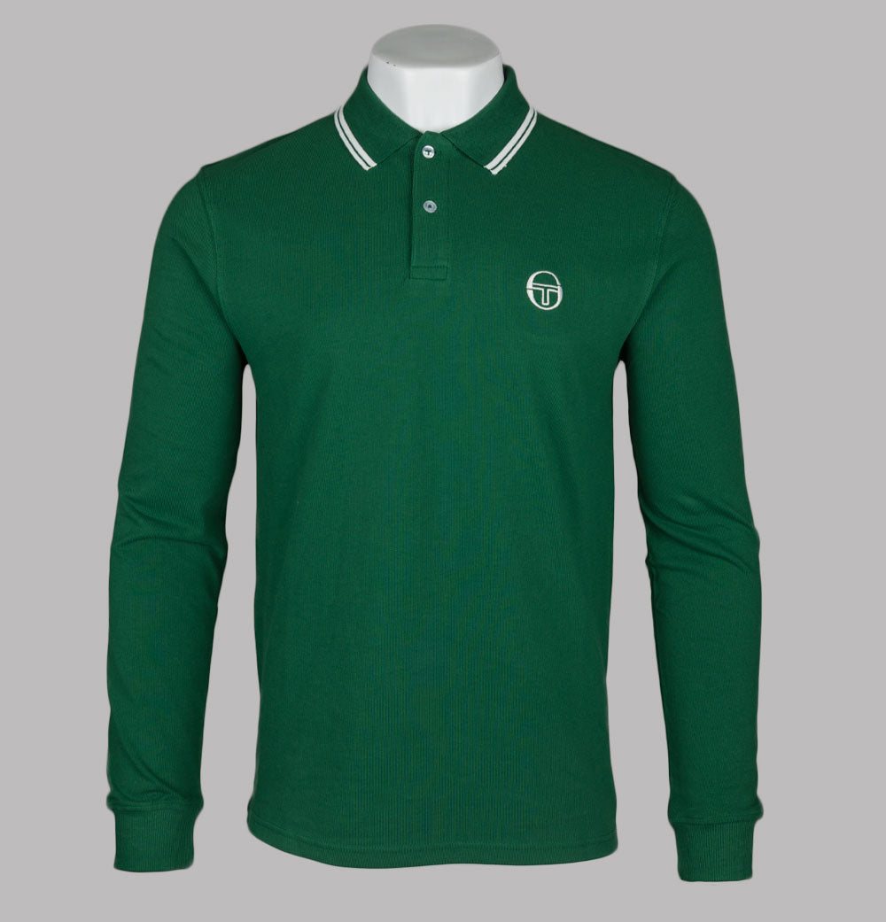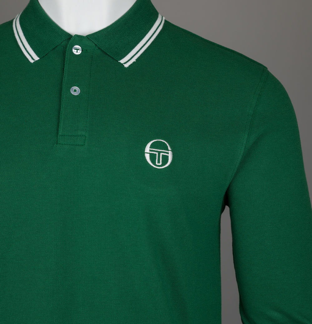Sergio Tacchini 020 long sleeve polo shirt in Eden/Gardenia. Cotton pique fabric. Ribbed collar with stripe detail. Two button placket with Sergio Tacchini branded buttons. Sergio Tacchini logo on the chest. Ribbed sleeve cuffs. Slim fit. 100% cotton.