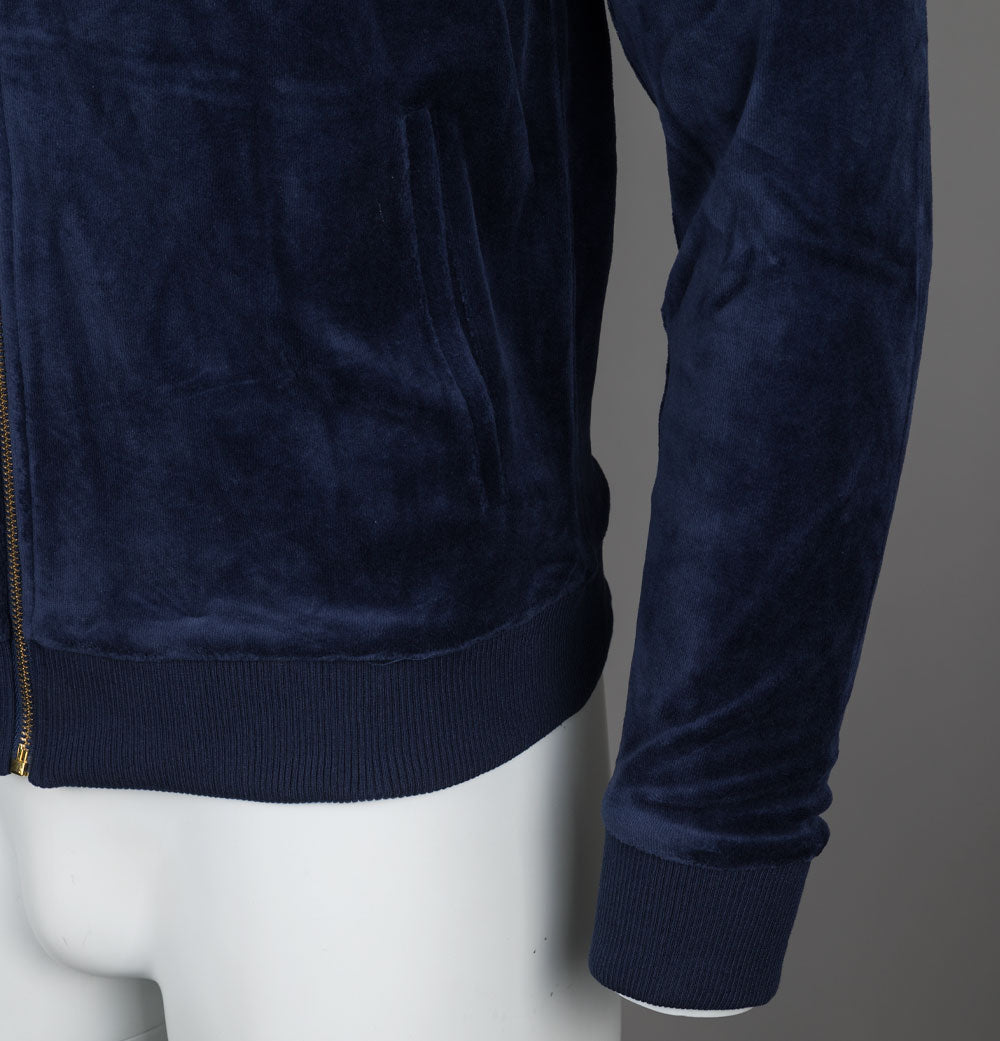 Sergio Tacchini Court Velour track top in Maritime Blue/Gardenia. Soft cotton/polyester velour fabric. Front zip up fastening with a Gold Sergio Tacchini branded zipper. Stand collar with internal stripe detail. Front pockets. Embroidered Sergio Tacchini logo on the chest. Ribbed sleeve cuffs and hem. Slim fit. 80% cotton, 20% polyester.