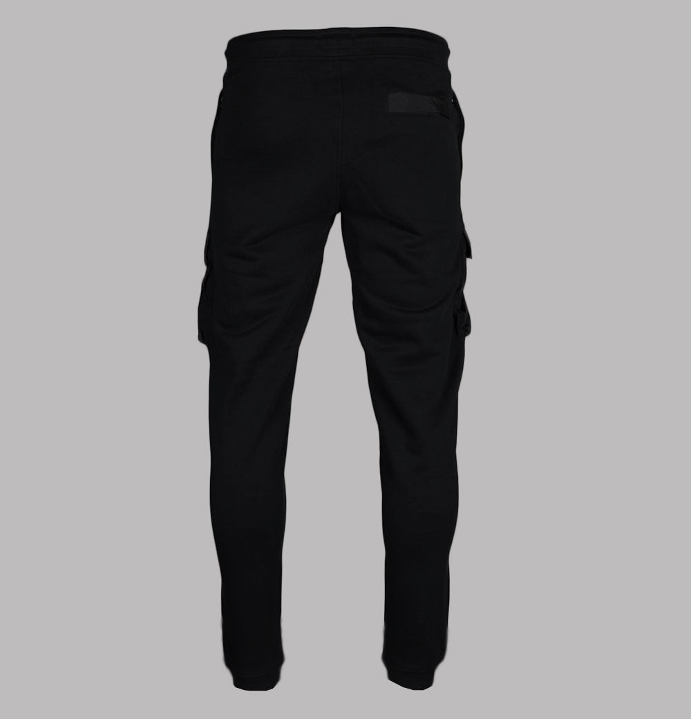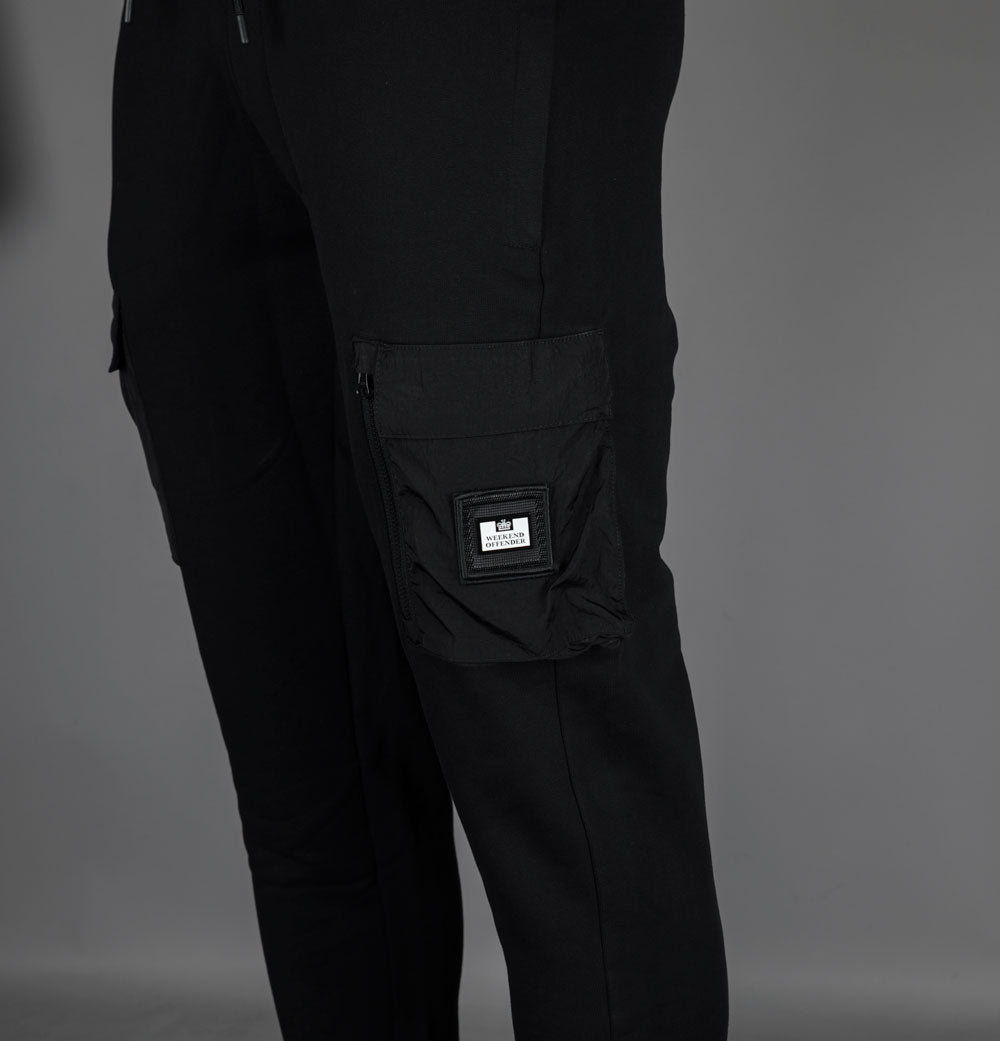 Weekend Offender Lippi joggers. Black brushed back cotton fabric. Adjustable draw cord waist band. Front zip pockets. Nylon parachute side cargo pockets. One back press stud pocket. Detachable Weekend Offender badge. Ribbed ankle cuffs. Regular fit. 100% cotton.