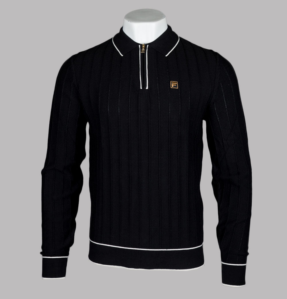 Fila Gold Sully long sleeve polo shirt in Black. Premium cotton fabric. Ribbed collar with Gold Fila branded 1/4 zip. White piping detail. Embroidered Gold Fila box logo. Ribbed sleeve cuffs and hem. Regular fit. 100% cotton.