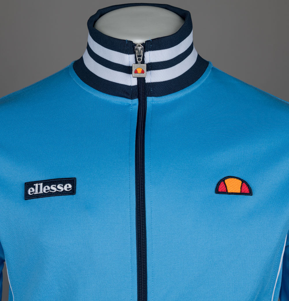 Ellesse Milan tracksuit top. Blue cotton/polyester blend fabric. Full front zip up fastening with an Ellesse branded zipper. Ribbed collar, sleeve cuffs and hem with White and Navy stripe detail. Embroidered Ellesse logo on the chest. Two front pockets. White piping detail. Regular fit. 50% cotton, 50% polyester.