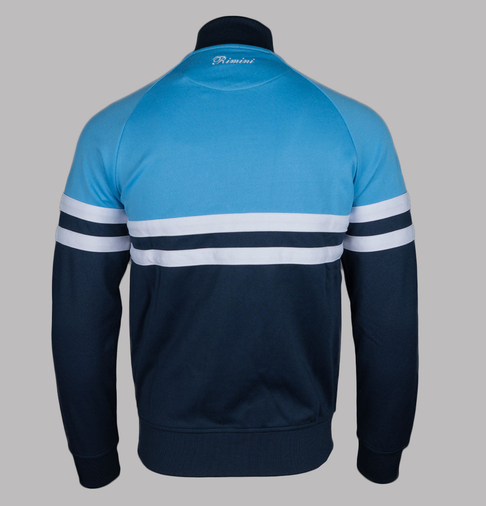 Ellesse Rimini tracksuit top. Blue and Navy cotton/polyester blend fabric. White panel stripes running across the chest, back and sleeves. Full front zip up fastening with an Ellesse branded zipper. Ribbed funnel neck collar. Ribbed sleeve cuffs and hem. Embroidered Ellesse branding on the chest. Embroidered signature Rimini logo on the back in White. Regular fit. 50% cotton, 50% polyester.