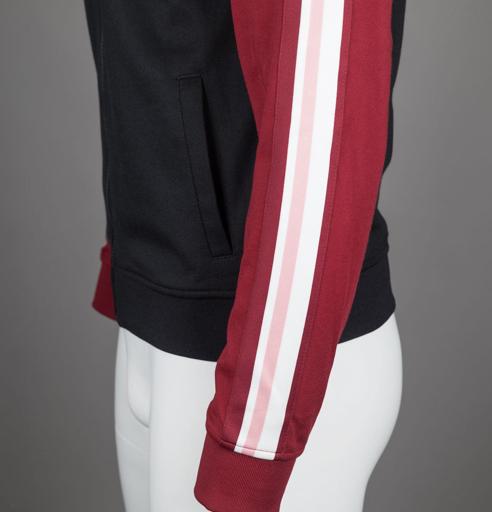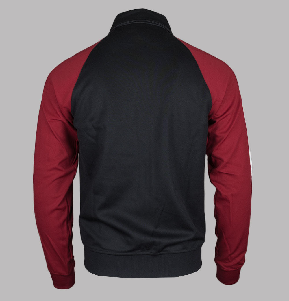 Sergio Tacchini Renshaw track top. Black cotton/polyester blend fabric. Rhubarb sleeves with woven panel detail. Front zip up fastening with a Sergio Tacchini branded zipper. Classic pointed collar. Front pockets. Embroidered Sergio Tacchini logo on the chest. Ribbed sleeve cuffs and hem. Slim fit. 53% polyester, 47% cotton.