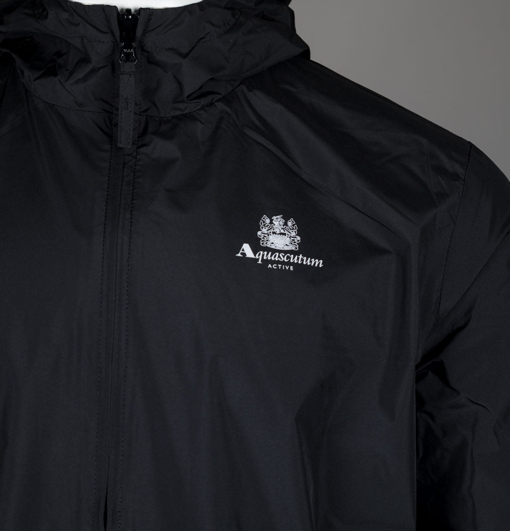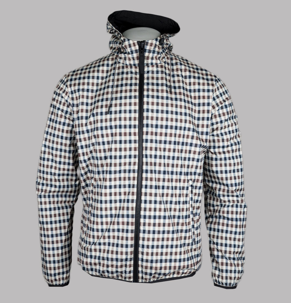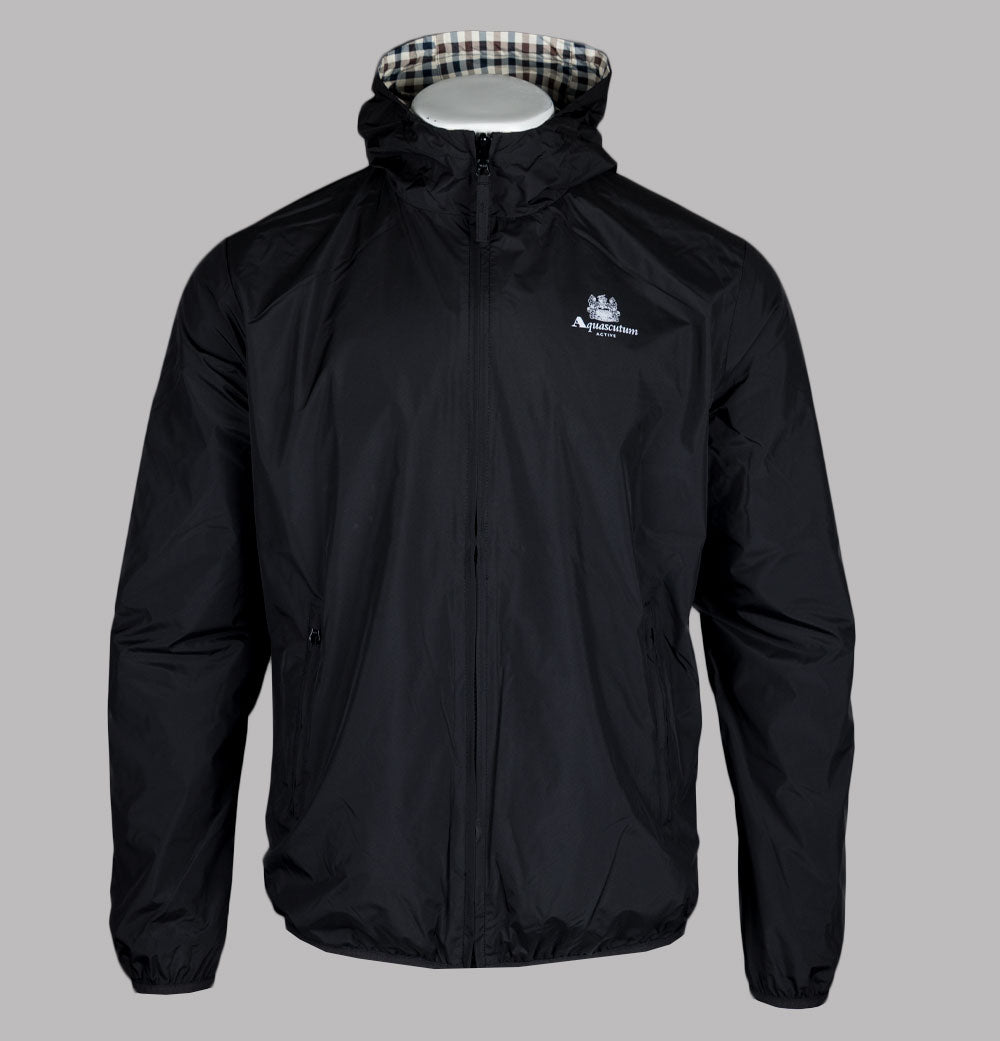 Aquascutum reversible hooded Sailor jacket. Lightweight premium polyester fabric. Plain Black on one side and all over club check on the reverse. Front zip up fastening. Front zip pockets. Draw cord adjustable hood. Printed Aquascutum branding. Elastic binding on the sleeve cuffs and hem. Slim fit. 100% polyester.