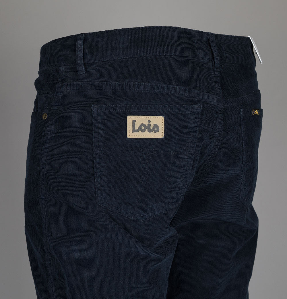 Lois Dario fine needle cords in Navy Blue. Soft cotton corduroy fabric. Classic 5 pocket style. Button up fly with Lois branded buttons. Lois Bull branding on the front pocket. Embroidered Lois branding on the back pockets. Belt loops. Tonal stitch detail. Regular fitting waist with boot cut legs. 98% cotton, 2% elastane. Made in Spain.