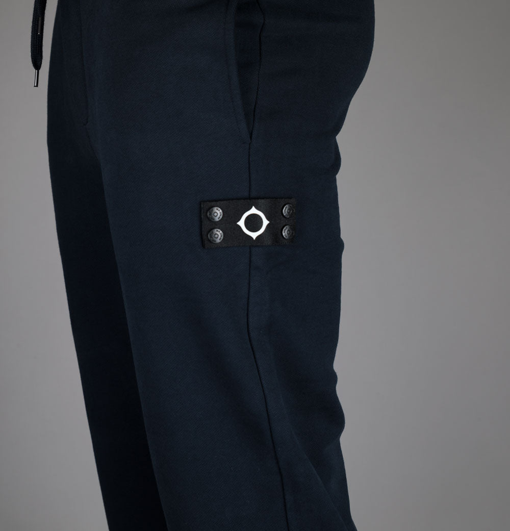 Ma.Strum Neo track pants in Ink Navy. Premium loopback cotton jersey fabric. Draw cord waistband. Detachable Ma.Strum Compass ID badge on the leg. Front pockets. Ribbed ankle cuffs. Tonal stitch detail. Regular fit. 100% cotton.