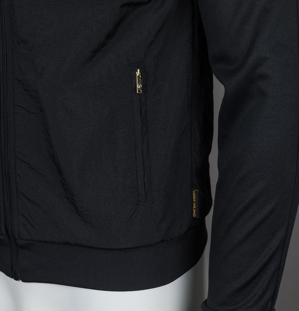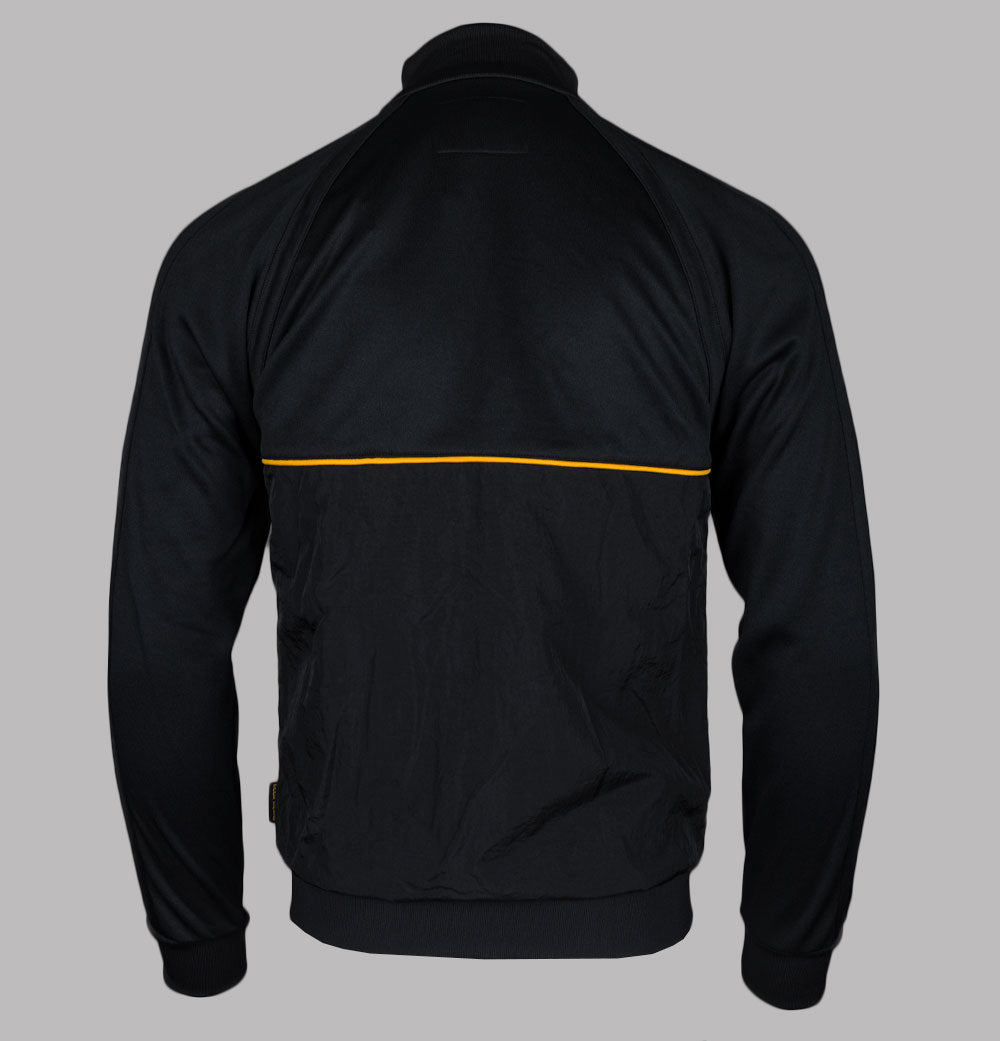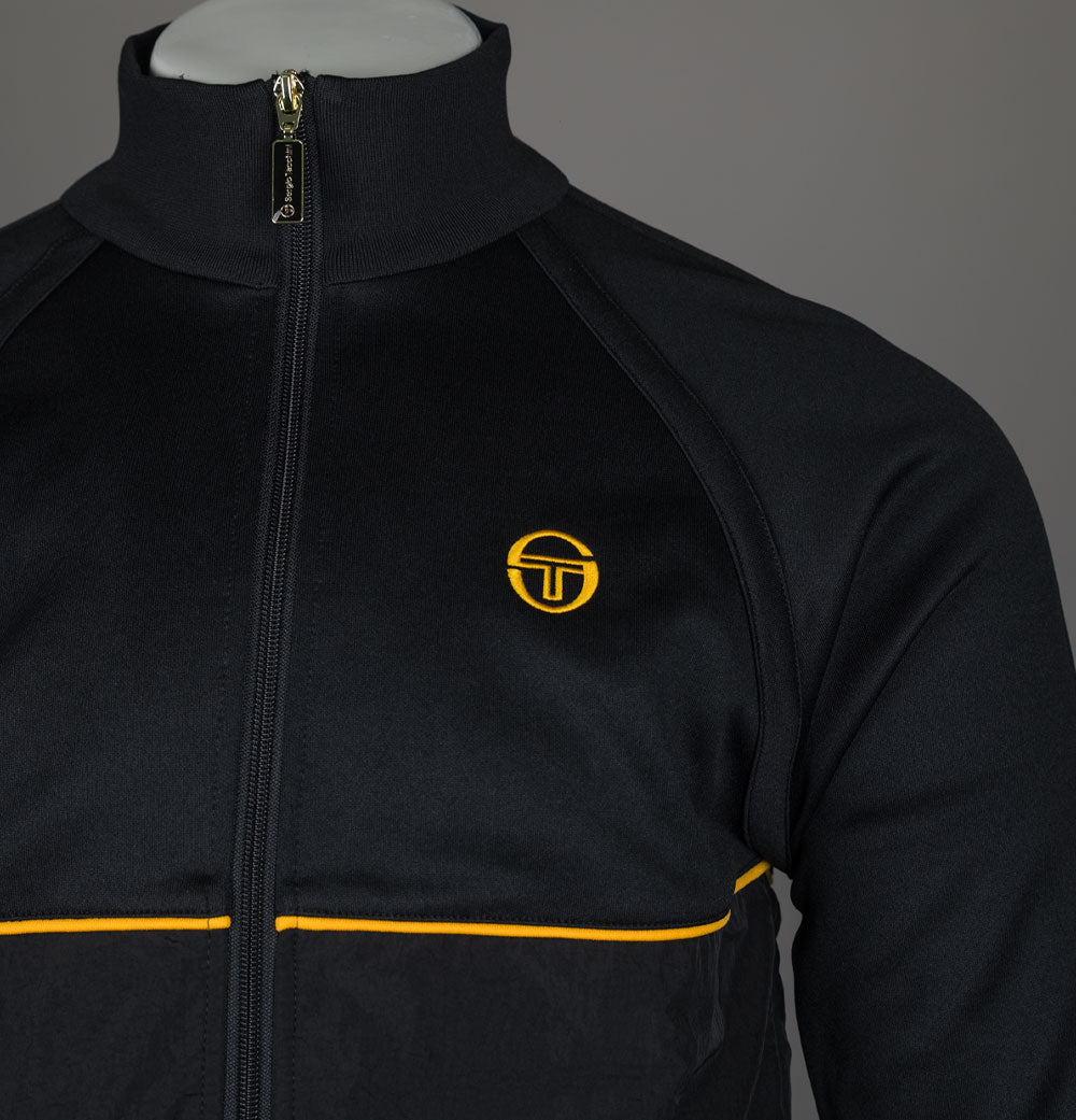 Sergio Tacchini New Catania track top in Black. Cotton/polyester blend fabric. Nylon lower body. Front zip up fastening with a Sergio Tacchini branded zipper. Gold front zip pockets. Tonal panel detail on the shoulders and sleeves. Piping across the chest and back. Sergio Tacchini logo on the chest. Ribbed collar, sleeve cuffs and hem. Slim fit. Upper body: 80% cotton, 20% polyester, lower body: 100% nylon.