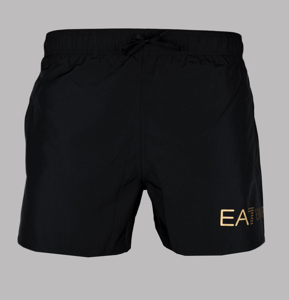 EA7 Emporio Armani logo swim shorts. Black lightweight polyester fabric. Elasticated waistband with adjustable draw cord. Front pockets. Gold EA7 Emporio Armani printed logo on the left leg. Mesh lining. Regular fit. 100% polyester.