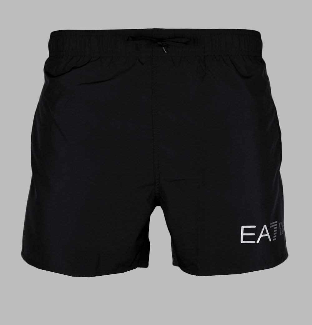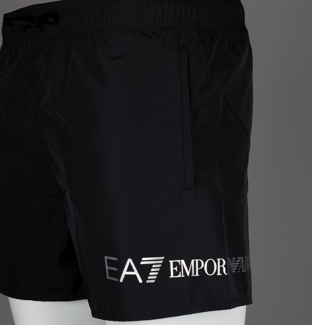 EA7 Emporio Armani logo swim shorts. Black lightweight polyester fabric. Elasticated waistband with adjustable draw cord. Front pockets. Silver EA7 Emporio Armani printed logo on the left leg. Mesh lining. Regular fit. 100% polyester.