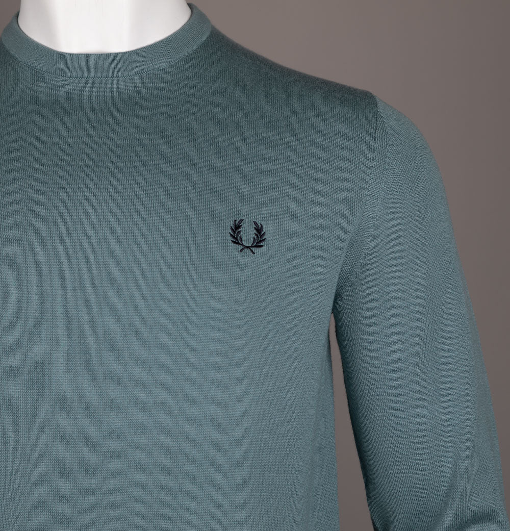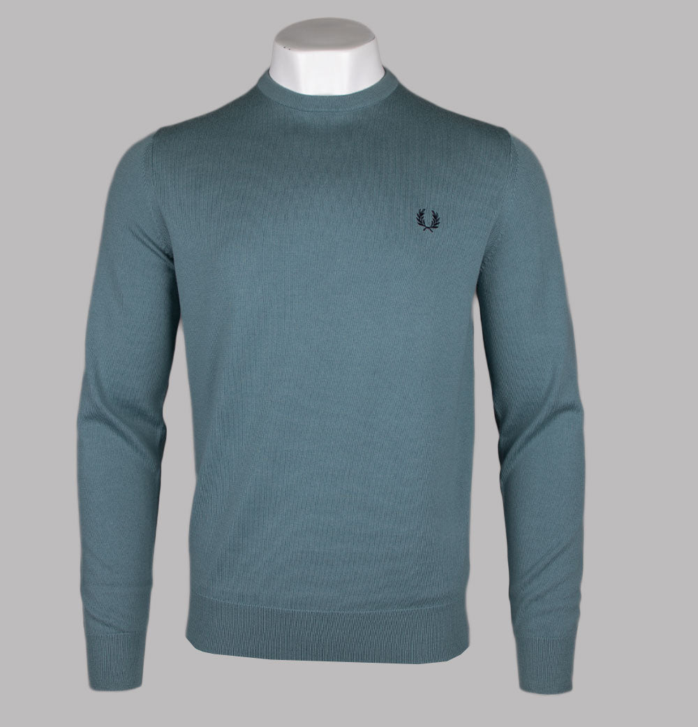Fred Perry classic crew neck jumper in Stockport Blue. Soft merino wool/cotton blend fabric. Ribbed crew neck. Twin tipped detail inside the neck. Embroidered Laurel Wreath on the chest. Ribbed sleeve cuffs and hem. Tonal stitch detail. Regular fit. 52% wool, 48% cotton.