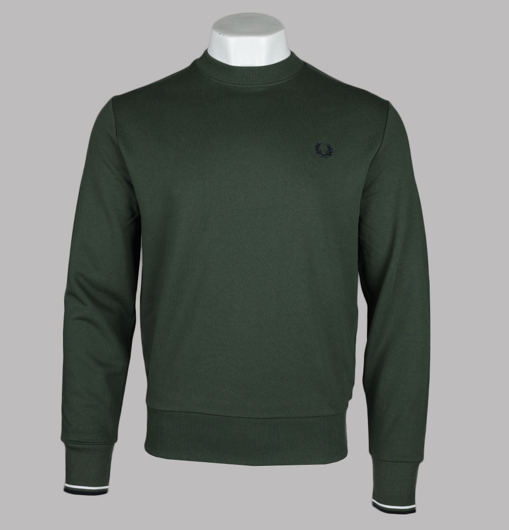 Fred Perry crew neck sweatshirt in Court Green/Snow White/Navy. Loopback cotton jersey fabric. Ribbed crew neck. Ribbed sleeve cuffs with twin stripe detail. Embroidered Laurel Wreath on the chest. Ribbed waistband. Regular fit. 100% cotton.