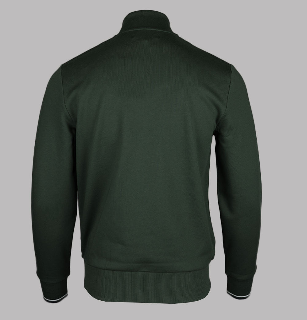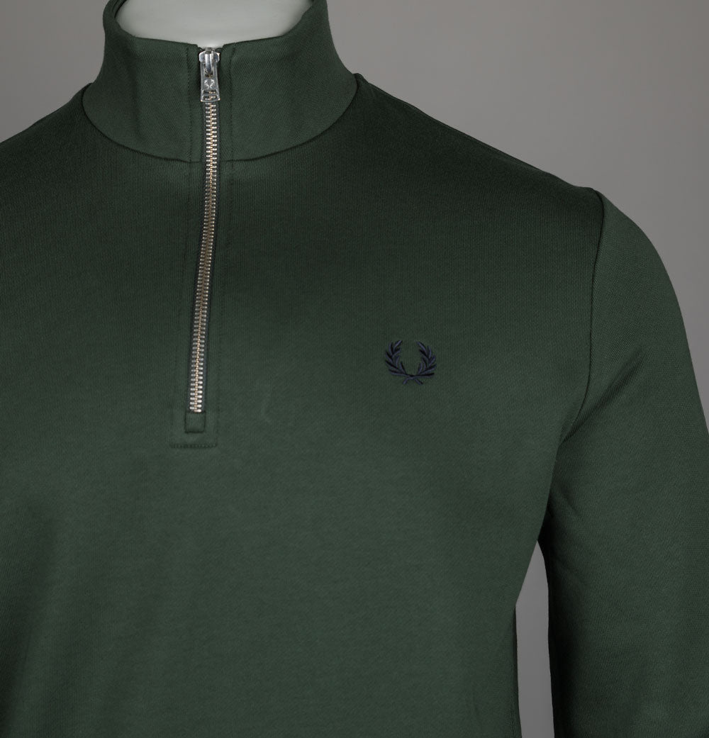 Fred Perry half zip sweatshirt in Court Green/Snow White/Navy. Soft loopback cotton jersey fabric. Half zip funnel neck collar. Embroidered Laurel Wreath on the chest. Ribbed sleeve cuffs with twin tipped detail. Ribbed hem. Regular fit. 100% cotton.