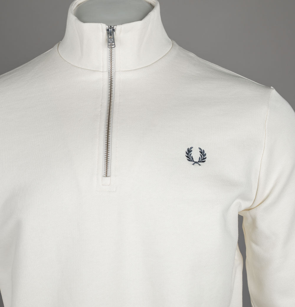 Fred Perry half zip sweatshirt in Ecru/Tennis Ball Yellow/Anchor Grey. Soft loopback cotton jersey fabric. Half zip funnel neck collar. Embroidered Laurel Wreath on the chest. Ribbed sleeve cuffs with twin tipped detail. Ribbed hem. Regular fit. 100% cotton.