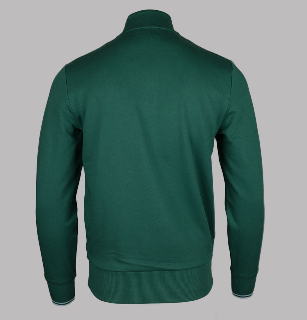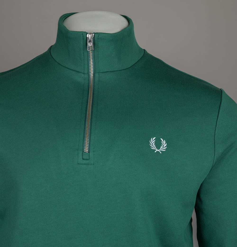 Fred Perry half zip sweatshirt. Sport Green soft loopback cotton jersey fabric. Half zip funnel neck collar. Embroidered Laurel Wreath on the chest. Ribbed sleeve cuffs with twin tipped detail in Track Blue. Ribbed hem. Regular fit. 100% cotton.
