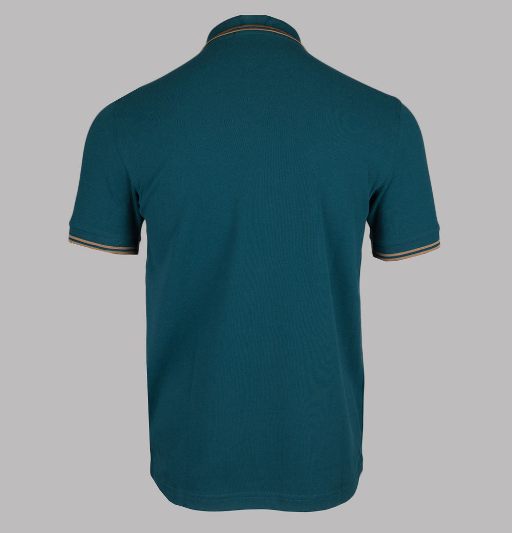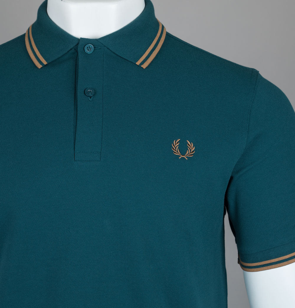 Fred Perry M3600 twin tipped short sleeve polo shirt. Dark Petrol premium cotton pique fabric. Two button placket with signature Fred Perry branded buttons. Twin tipped collar and arm cuffs in Shaded Stone. Embroidered Laurel Wreath on the chest in Shaded Stone. Regular fit. 100% cotton pique.