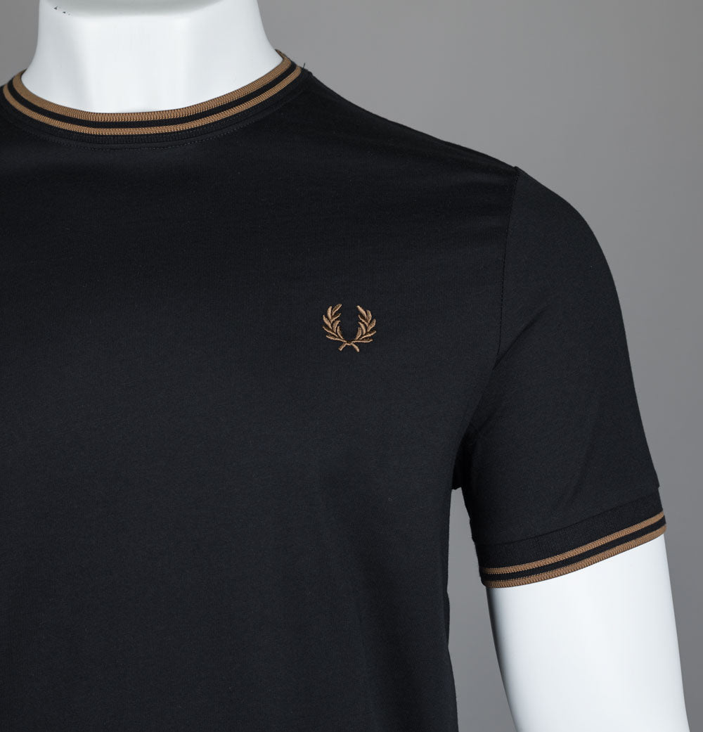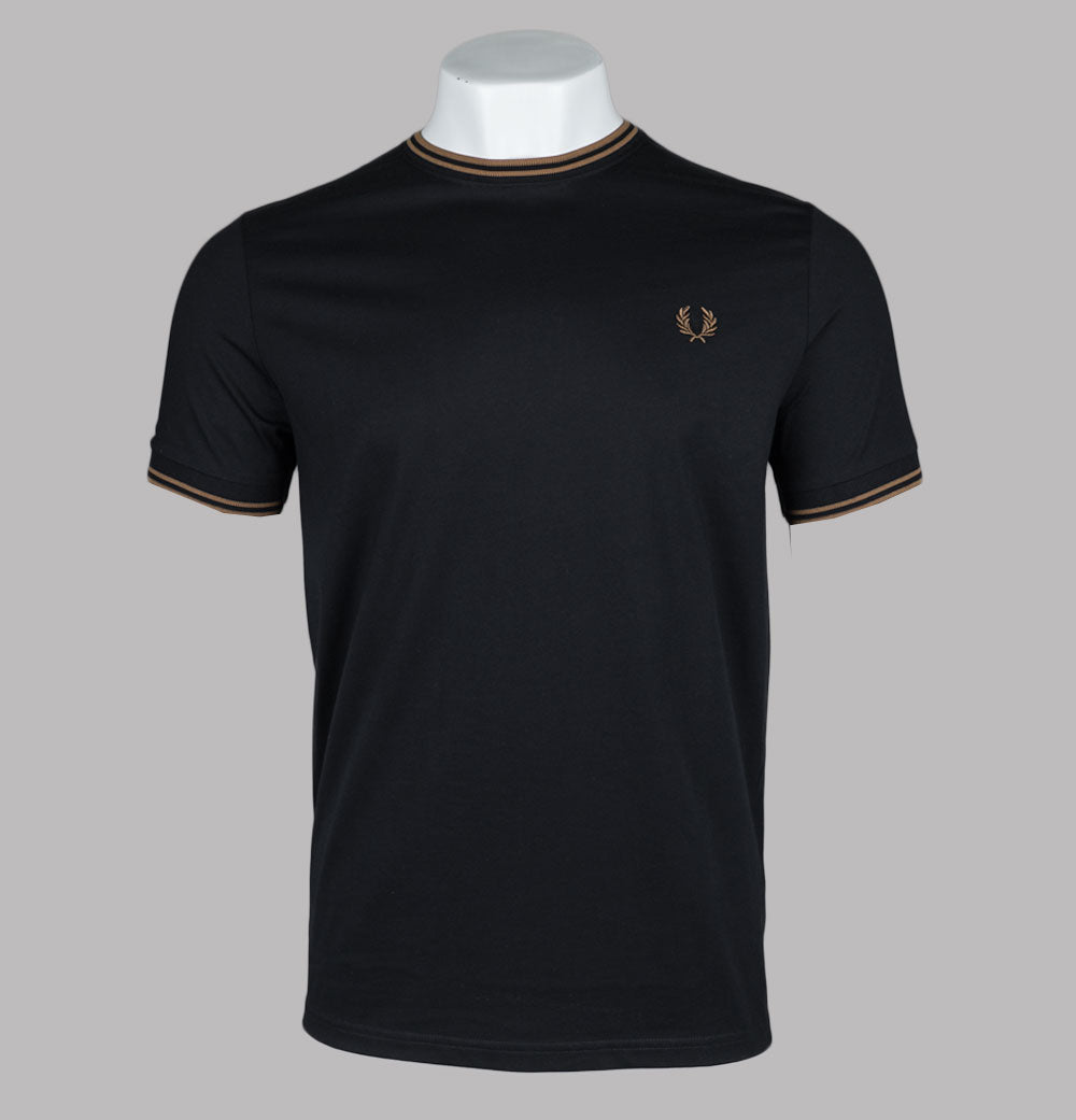 Fred Perry short sleeve twin tipped t-shirt. Black soft cotton jersey fabric. Twin tipped crew neck and short sleeve cuffs in Shaded Stone. Embroidered Laurel Wreath on the chest in Shaded Stone. Regular fit. 100% cotton.