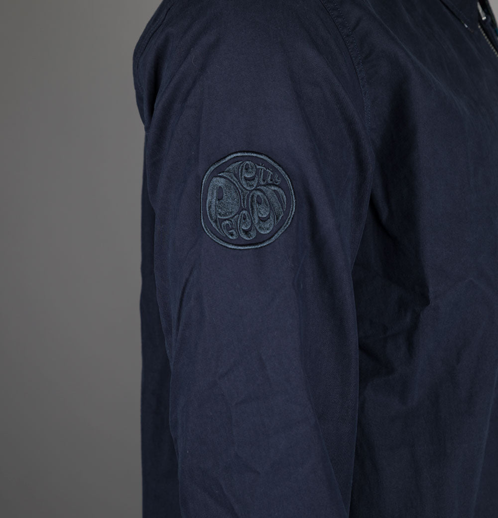 Pretty Green Feltham overshirt in Navy. Cotton/nylon blend fabric. Front zip up fastening. Pointed collar. One front chest pocket. Button sleeve cuffs., Embroidered Pretty Green logo. House paisley lining. Relaxed fit. 65% cotton, 35% nylon.