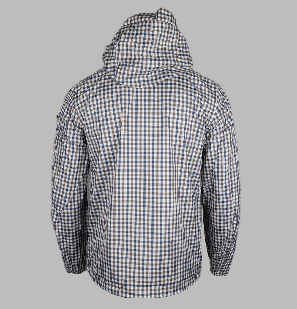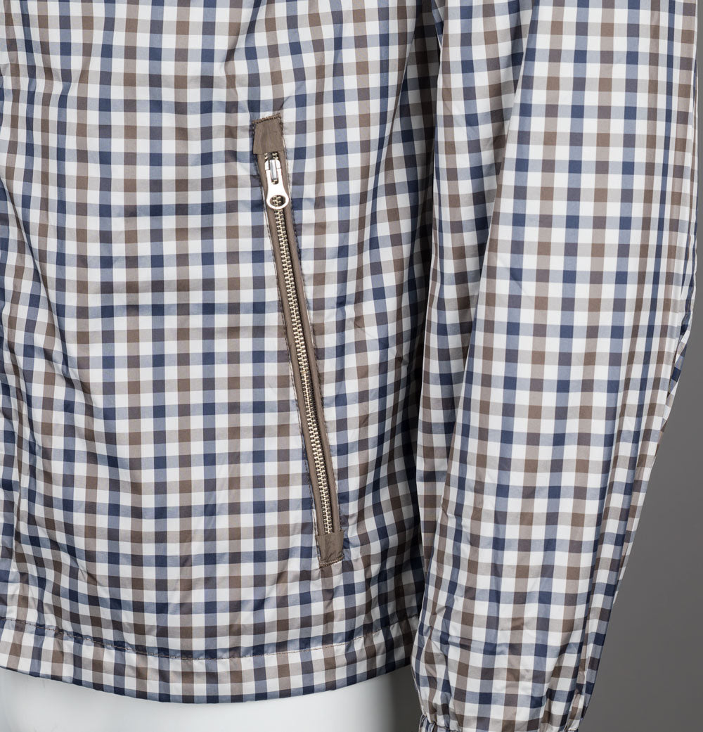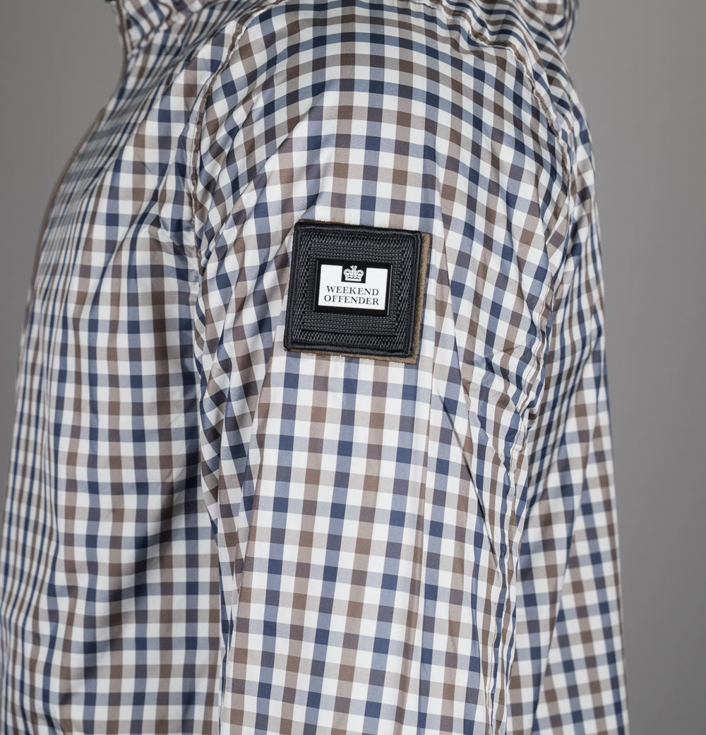Weekend Offender Campania jacket in Mid House Check. Woven nylon parachute style fabric with a durable water repellent coating. Polar fleece lining. Two way front zip up fastening. Multi panel hood with built in peak and internal draw cord. Front zip pockets. Detachable Weekend Offender badge. Elasticated sleeve cuffs. Tobacco piping detail. Bungee cord adjustable hem. Regular fit. Body: 100% nylon, lining: 100% polyester.