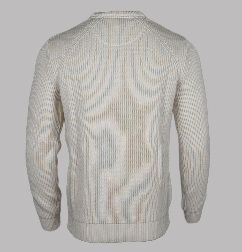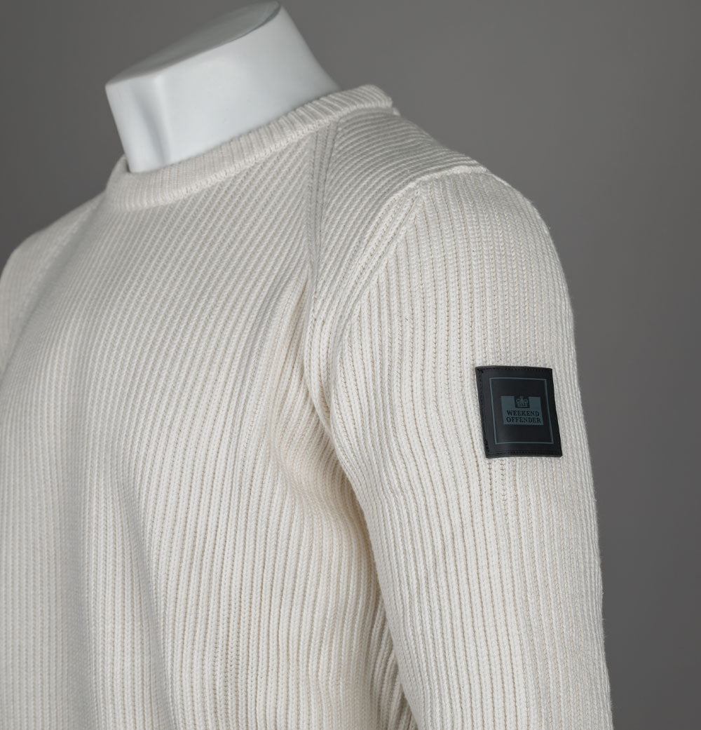 Weekend Offender Morello knitted jumper in Ivory. Chunky ribbed blended cotton fabric. Ribbed crew neck, sleeve cuffs and hem. Rubber Weekend Offender badge on the sleeve. Regular fit. 45% cotton, 45% acrylic, 10% nylon.