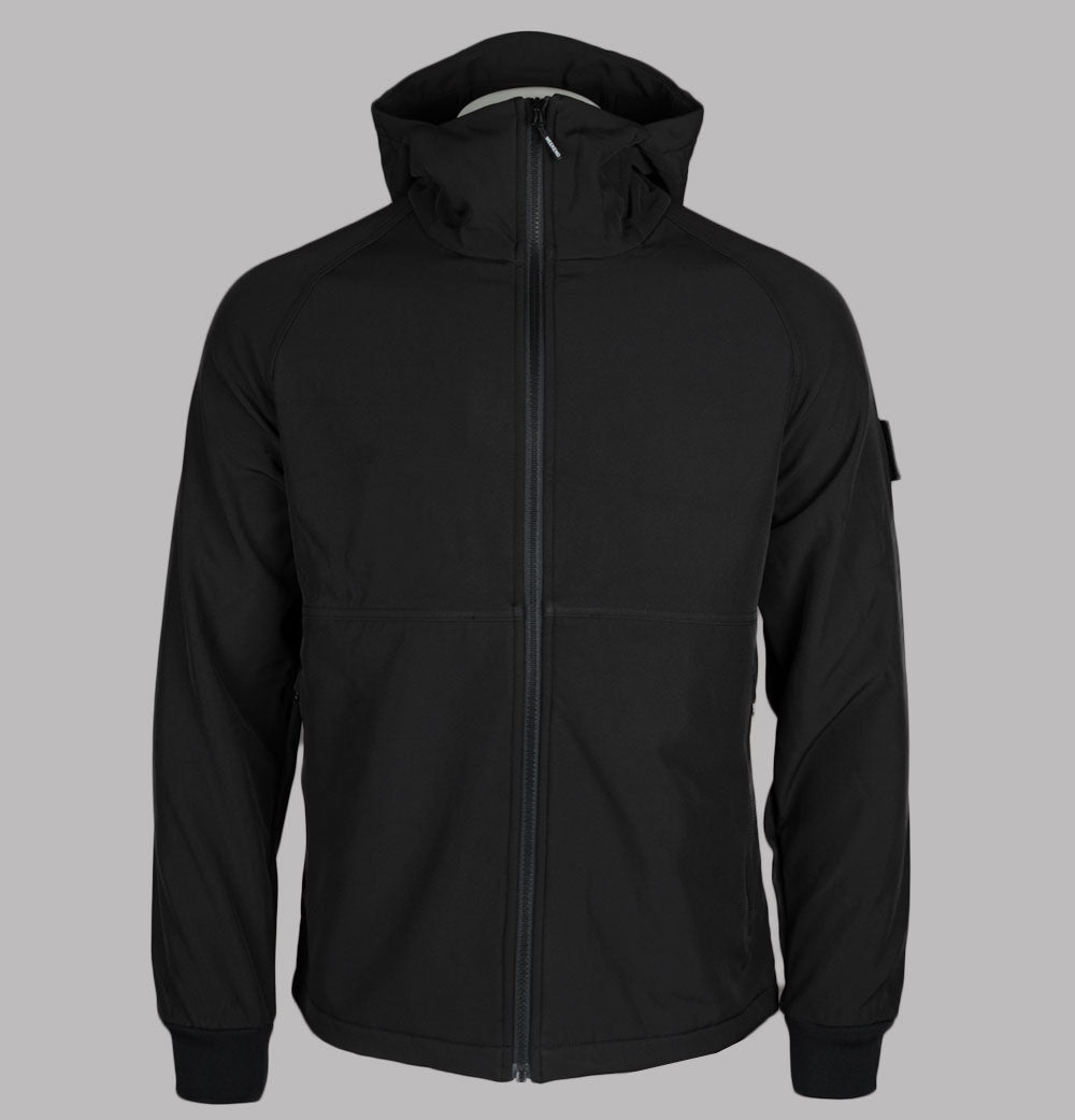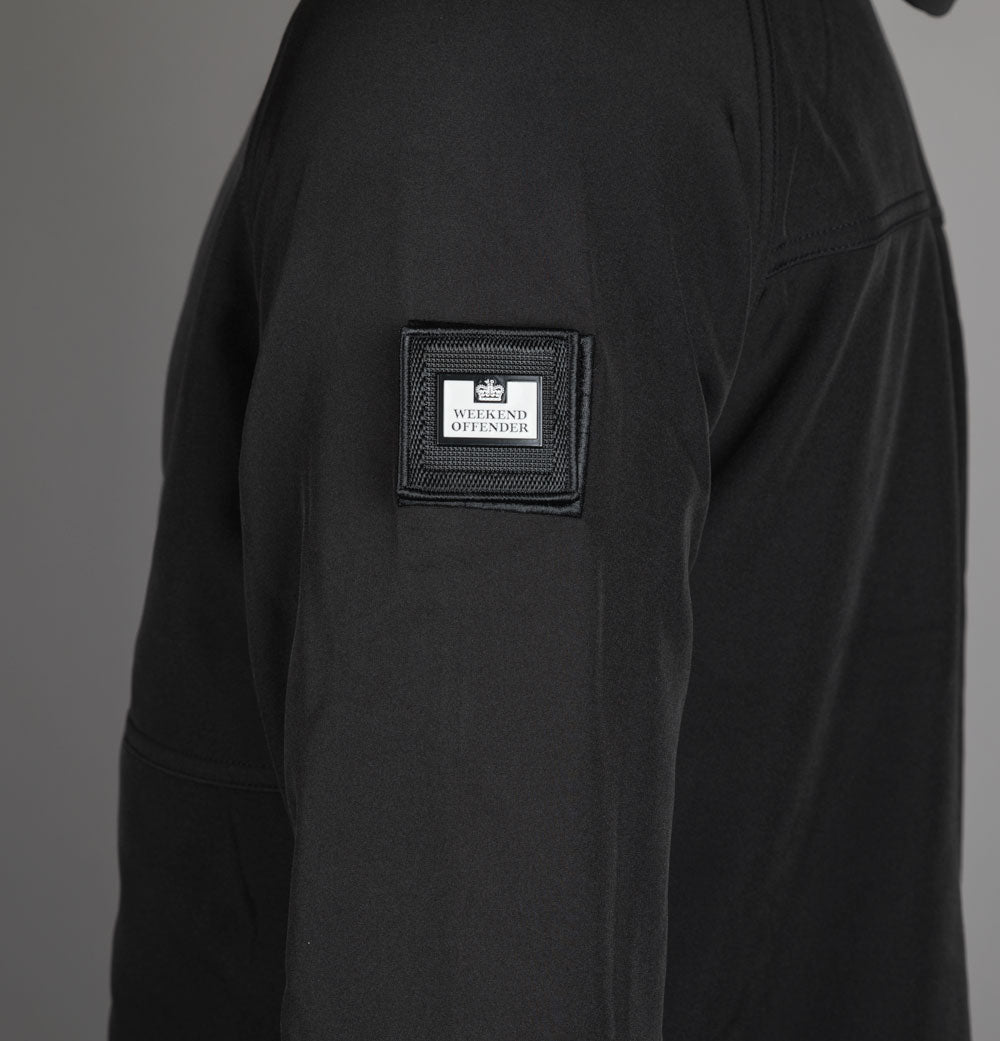 Weekend Offender Stipe softshell jacket in Black. Woven polyester/elastane softshell fabric with a durable water repellent coating and polar fleece lining. Front zip up fastening. Bungee cord adjustable peaked hood. Front zip pockets. Detachable Weekend Offender badge. Ribbed sleeve cuffs. Bungee cord adjustable hem. Regular fit. 92% polyester, 8% elastane.