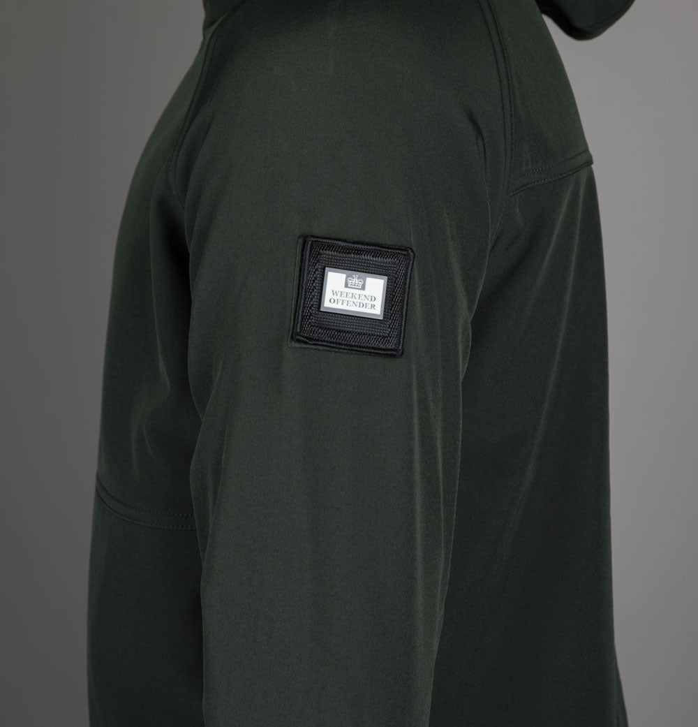 Weekend Offender Stipe softshell jacket in Black Forest. Woven polyester/elastane softshell fabric with a durable water repellent coating and polar fleece lining. Front zip up fastening. Bungee cord adjustable peaked hood. Front zip pockets. Detachable Weekend Offender badge. Ribbed sleeve cuffs. Bungee cord adjustable hem. Regular fit. 92% polyester, 8% elastane.