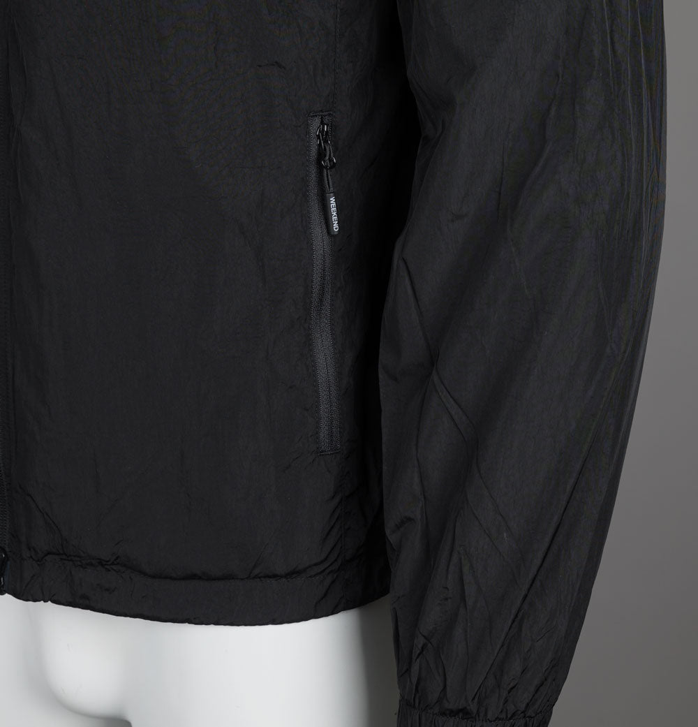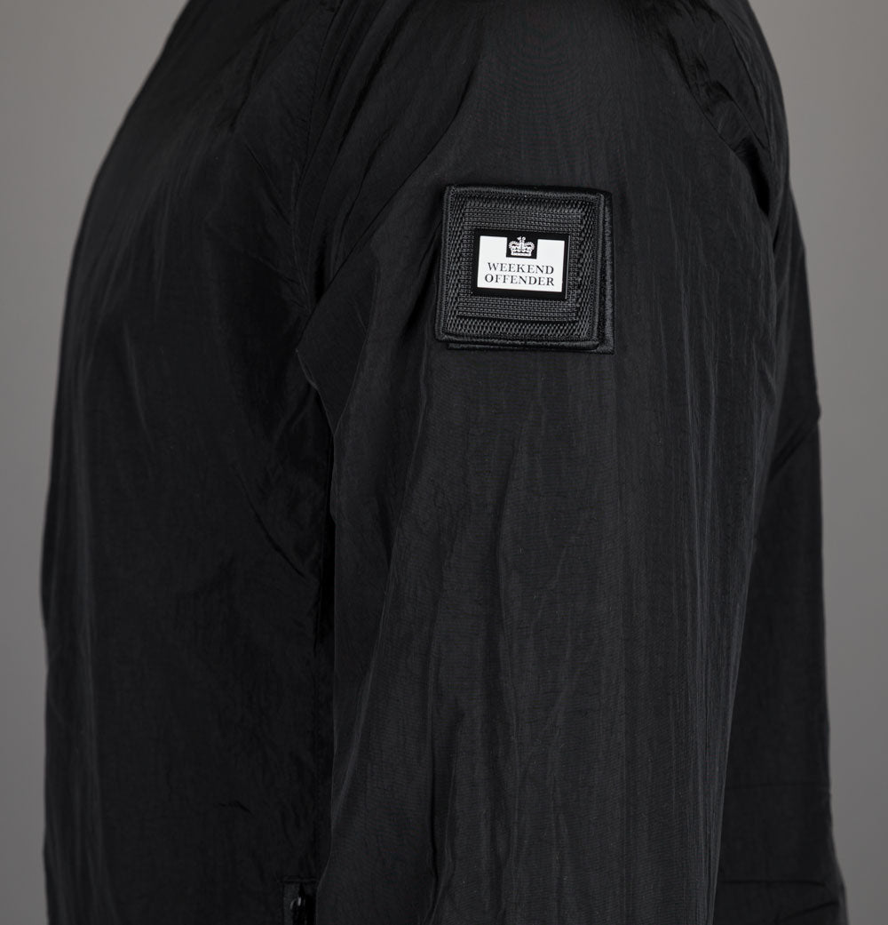Weekend Offender Technician fleece lined jacket in Black. Lightweight high density woven nylon parachute style fabric with a durable water repellent coating and polar fleece lining. Two way front zip up fastening. Bungee cord adjustable hood with a peak and built in face mask. Front zip pockets. Detachable Weekend Offender badge. Elasticated sleeve cuffs. Bungee cord adjustable hem. Regular fit. Body: 100% nylon, lining: 100% polyester.