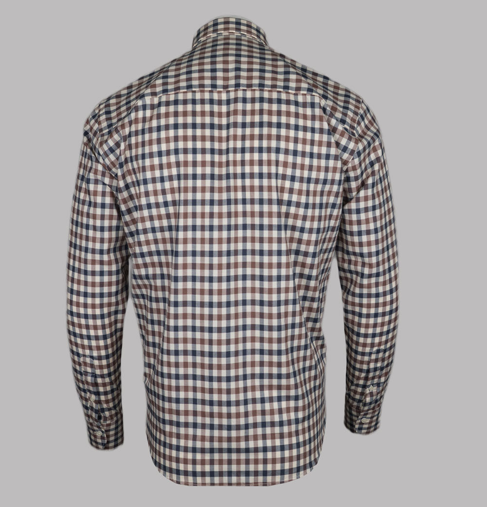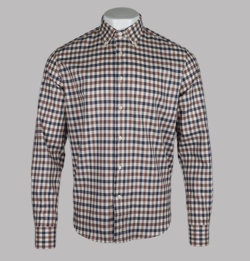 Aquascutum long sleeve Iconic club check shirt. Lightweight premium cotton fabric. All over club check design. Classic button down collar. Rounded hem. Slim fit. 100% cotton.