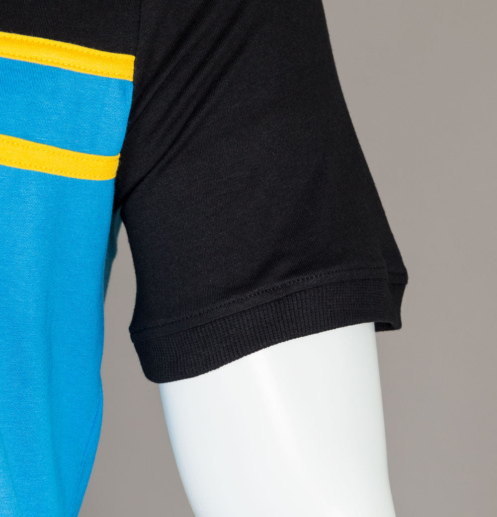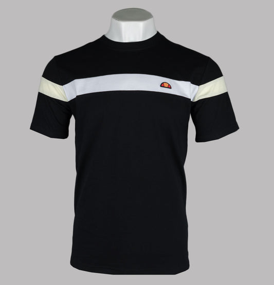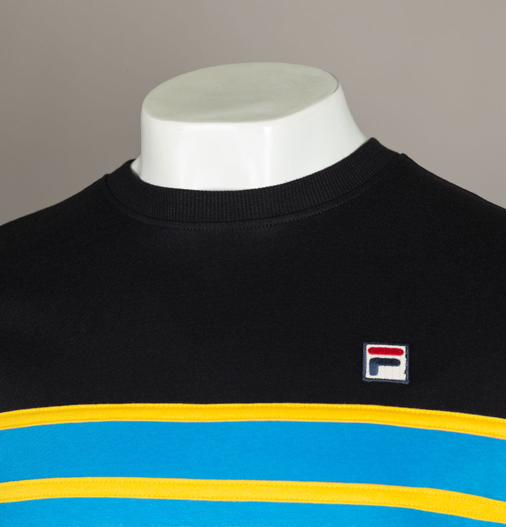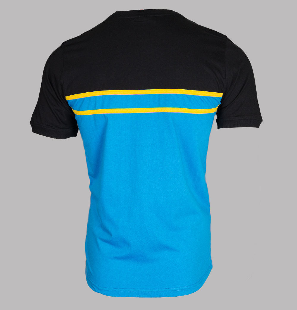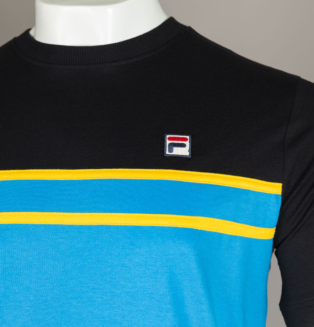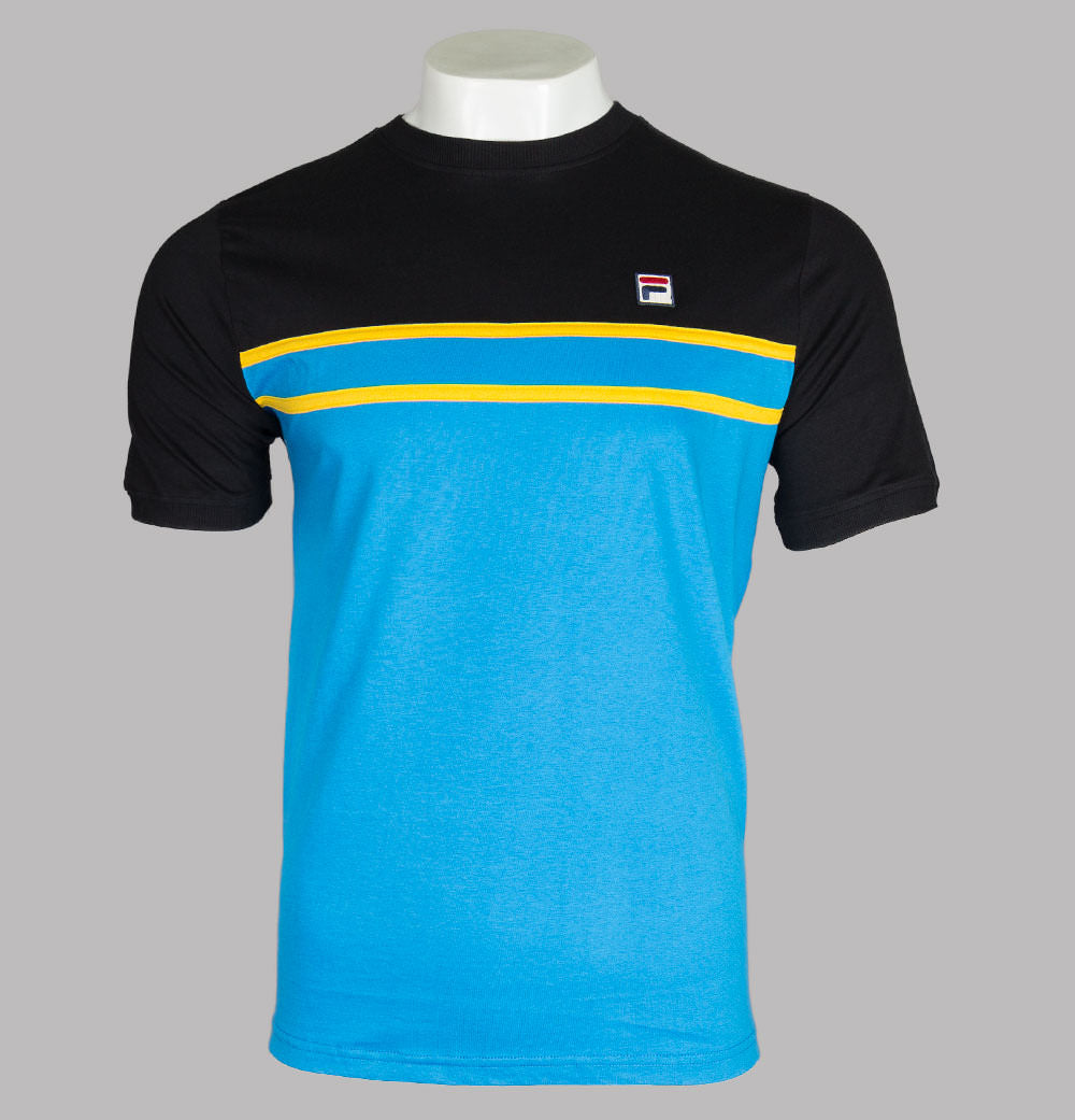 Fila Vintage short sleeve Baldi t-shirt. Blue Aster and Black premium cotton jersey fabric. Cut and sew panel detail in Yellow across the chest. Finely ribbed crew neck and short sleeve cuffs. Fila box logo embroidered on to the chest. Regular fit. 100% cotton.