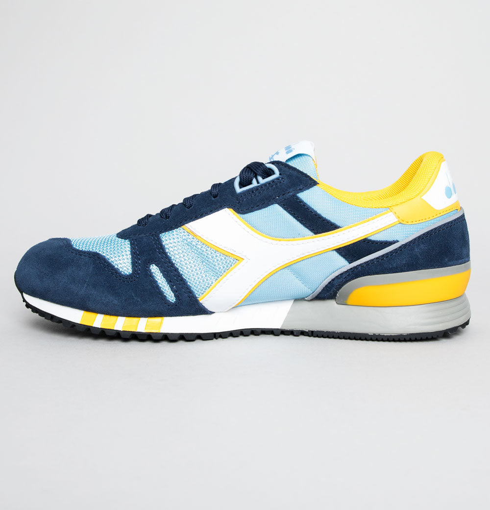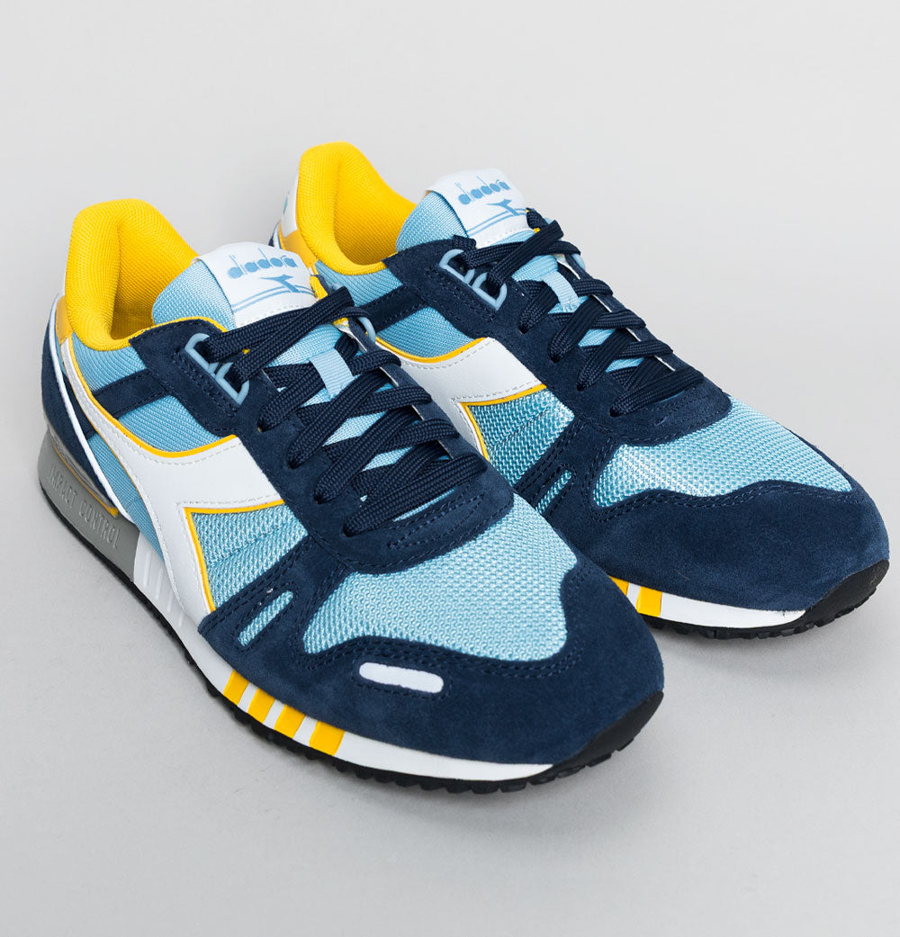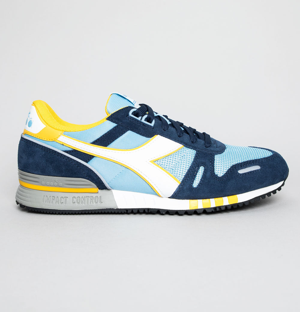 Diadora Titan trainers. Dusk Blue mesh uppers with Dress Blue premium suede overlays. White leather Diadora branding on the sides with Yellow trim. Heel tab with signature Diadora branding. Lace up fronts. Mesh toe panel. Diadora branded plastic heel stabiliser. Impact control rubber sole. Cushioned insole. All UK standard sizes.