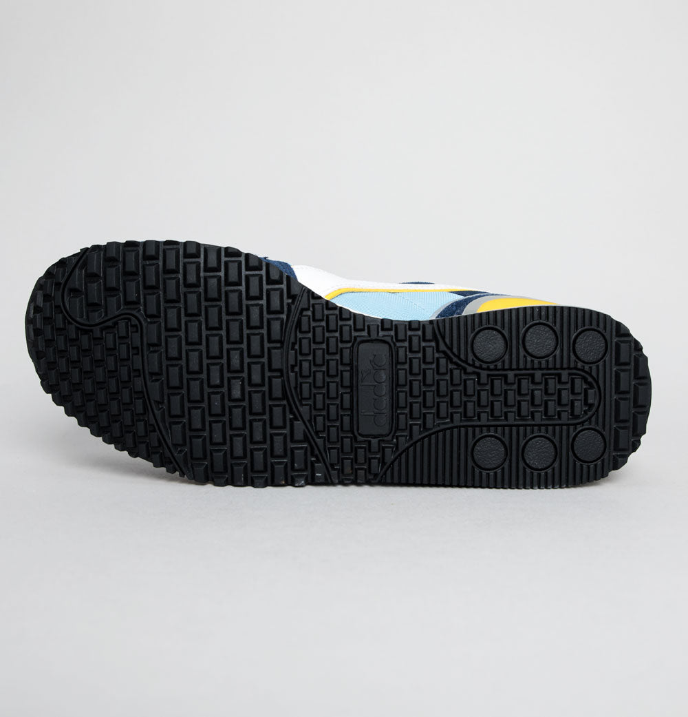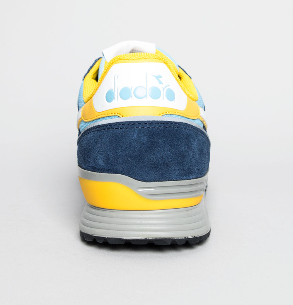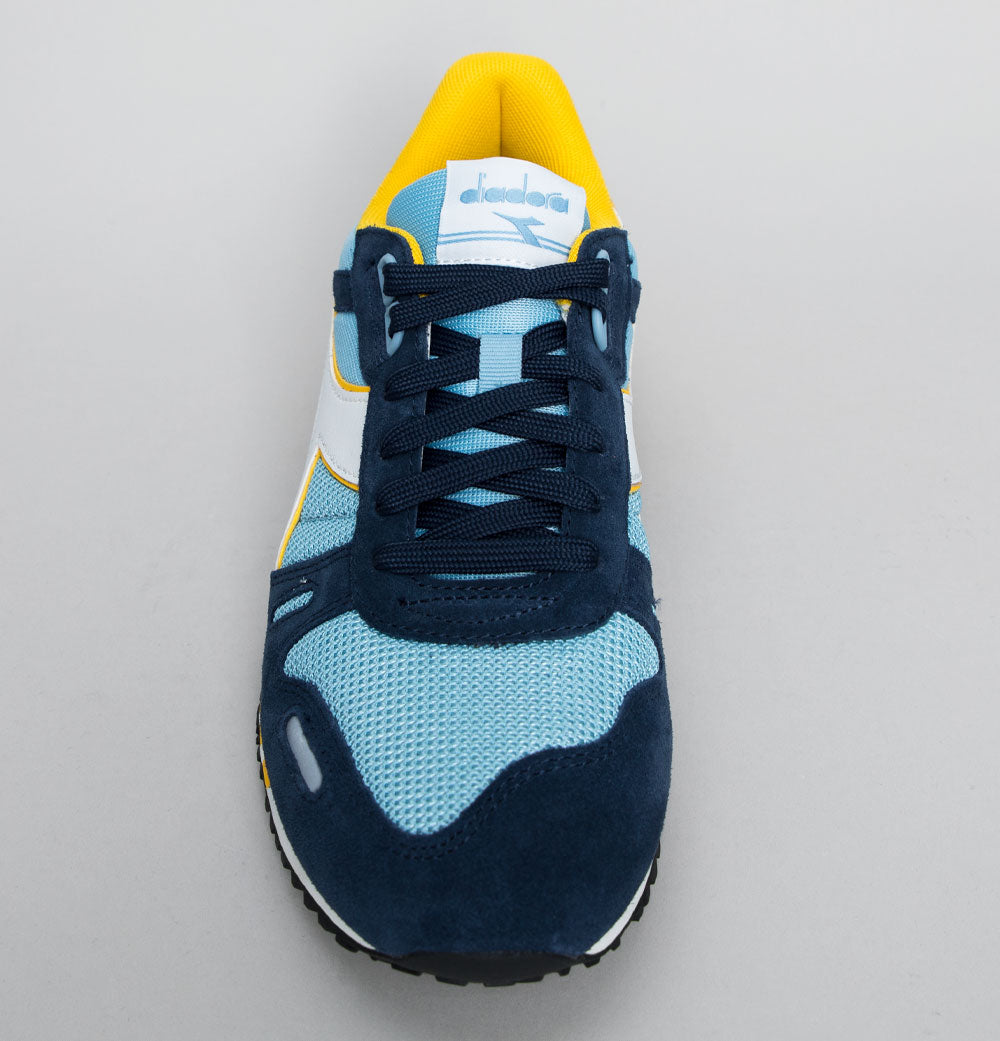 Diadora Titan trainers. Dusk Blue mesh uppers with Dress Blue premium suede overlays. White leather Diadora branding on the sides with Yellow trim. Heel tab with signature Diadora branding. Lace up fronts. Mesh toe panel. Diadora branded plastic heel stabiliser. Impact control rubber sole. Cushioned insole. All UK standard sizes.