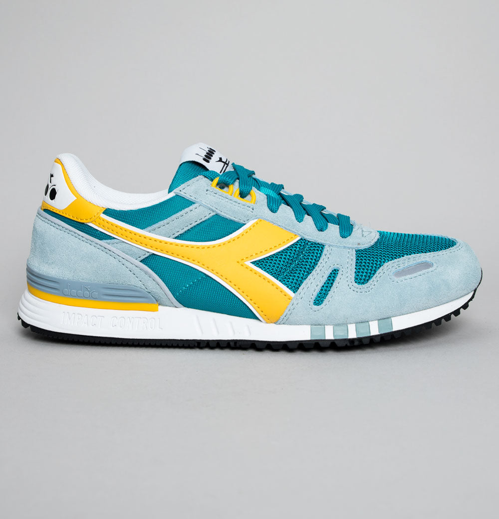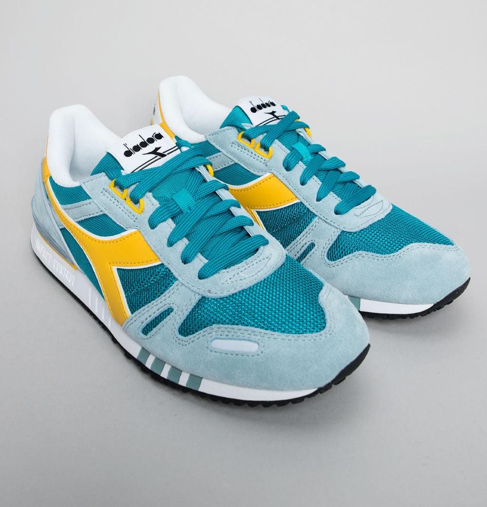 Diadora Titan trainers. Lake mesh uppers with Sky Blue premium suede overlays. Yellow leather Diadora branding on the sides with White trim. Heel tab with signature Diadora branding. Lace up fronts. Mesh toe panel. Diadora branded plastic heel stabiliser. Impact control rubber sole. Cushioned insole. All UK standard sizes.