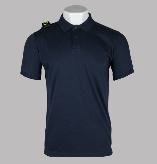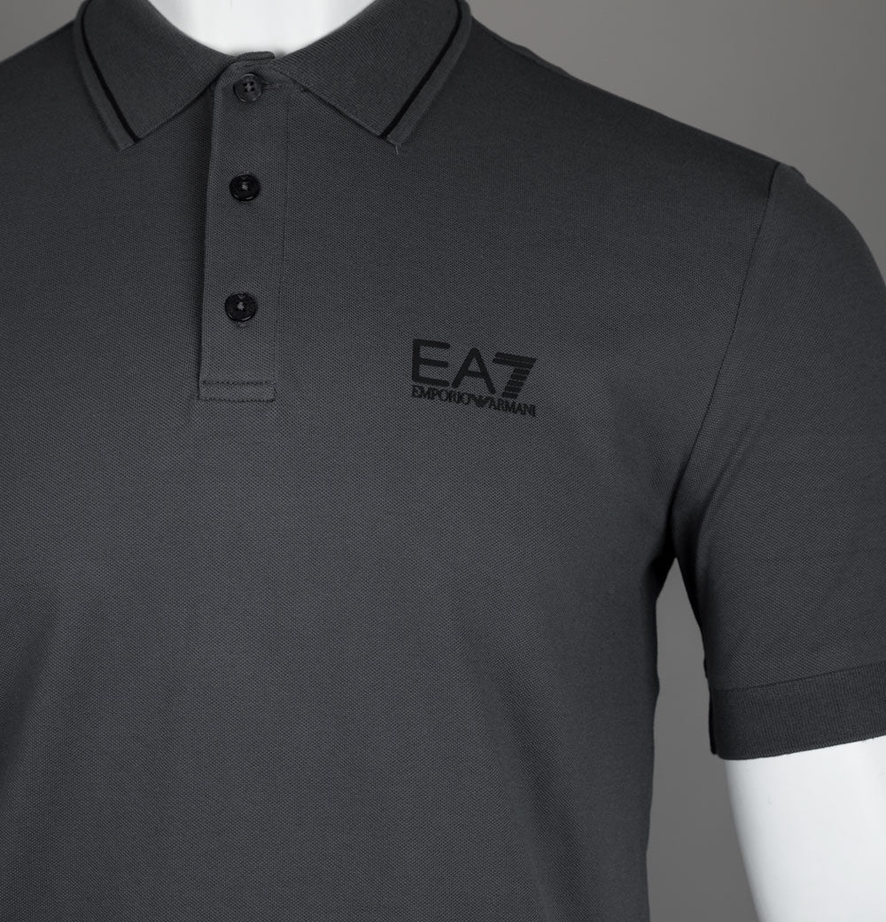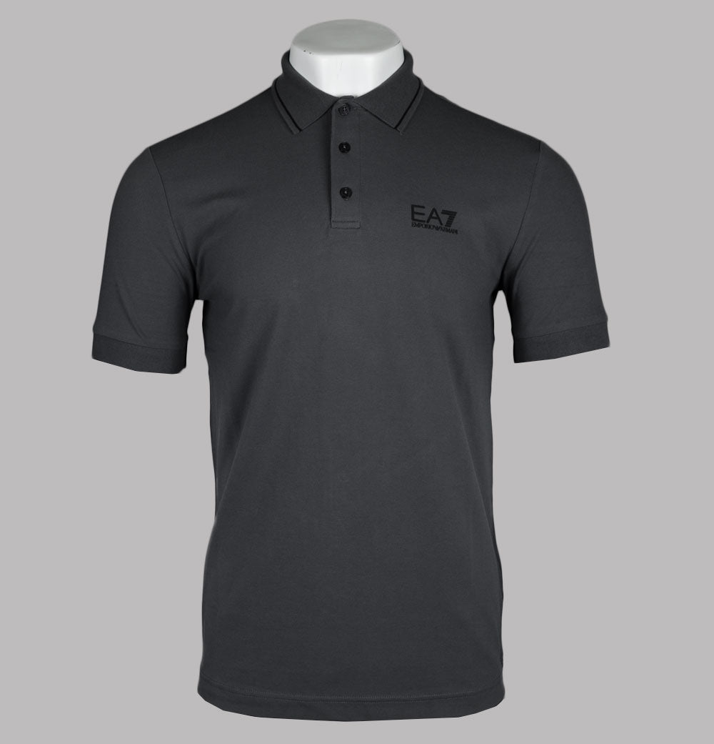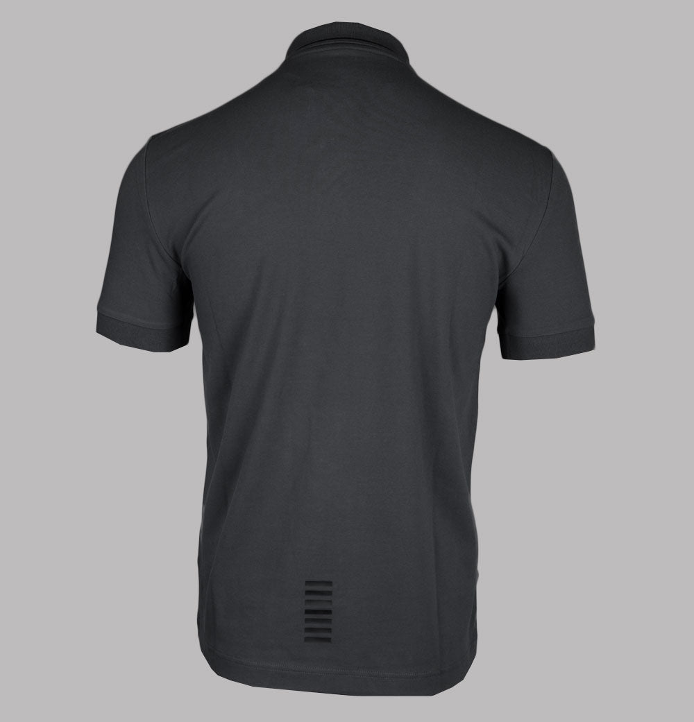 EA7 Emporio Armani short sleeve core identity polo shirt in Asphalt Grey. Premium stretch cotton pique fabric. Three button placket. Ribbed collar with tipped detail. Ribbed sleeve cuffs. Rubberised EA7 Emporio Armani logo. Rubberised stripe detail on the back. Slim fit. 97% cotton, 3% elastane.