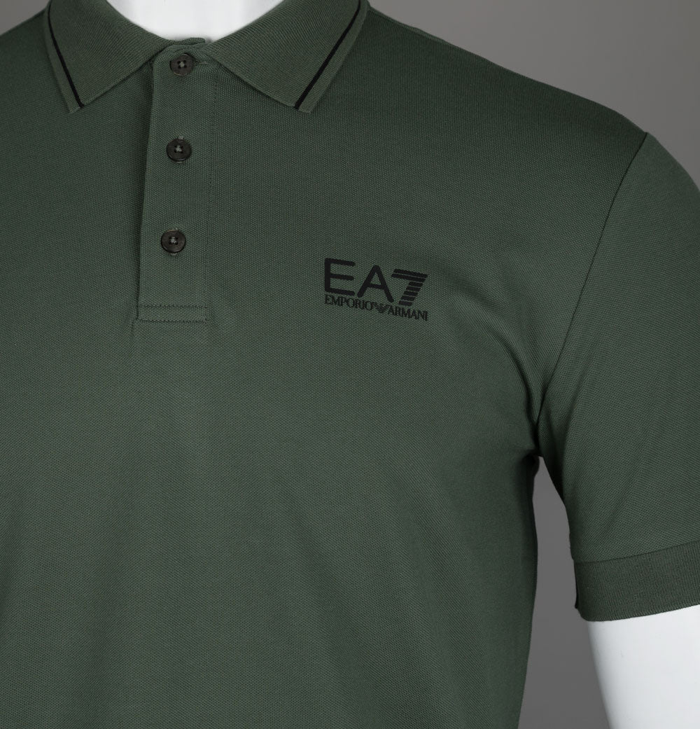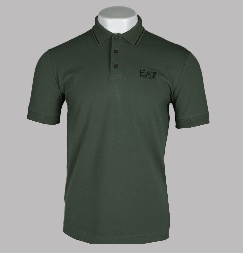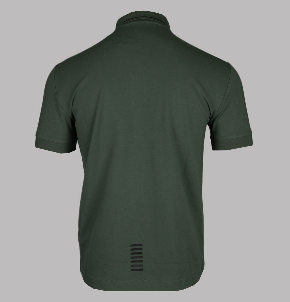 EA7 Emporio Armani short sleeve core identity polo shirt in Beetle Green. Premium stretch cotton pique fabric. Three button placket. Ribbed collar with tipped detail. Ribbed sleeve cuffs. Rubberised EA7 Emporio Armani logo. Rubberised stripe detail on the back. Slim fit. 97% cotton, 3% elastane.