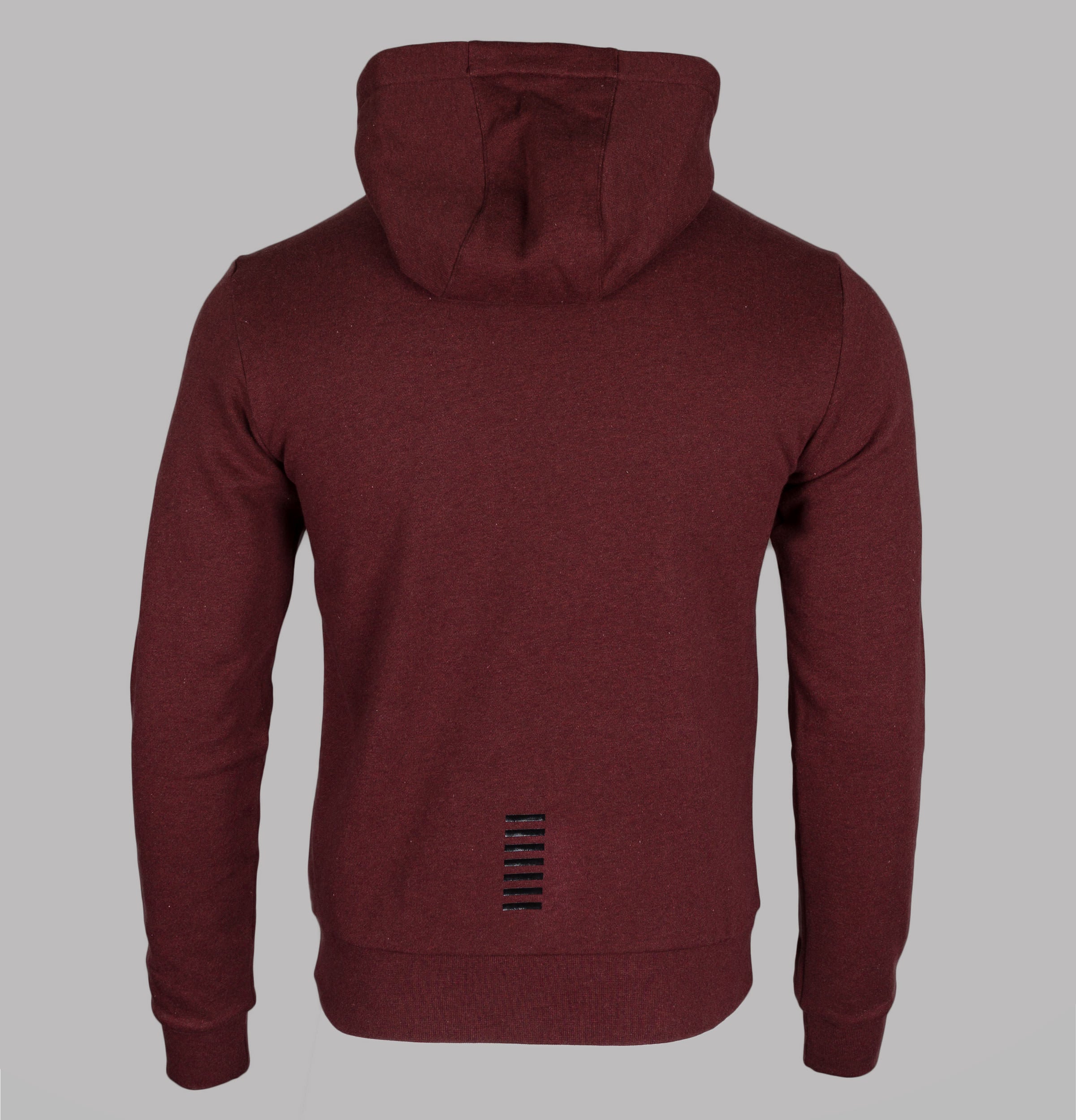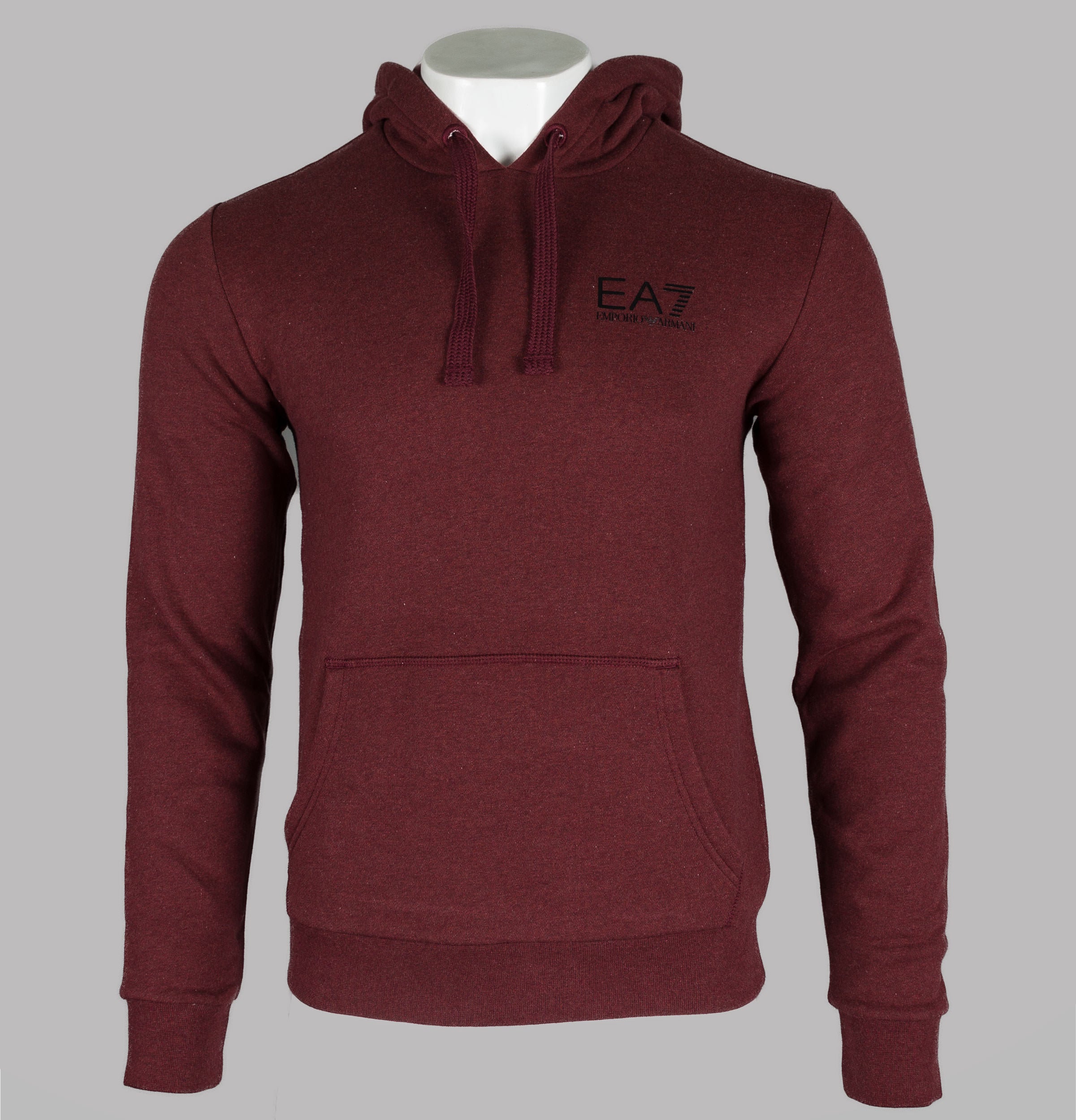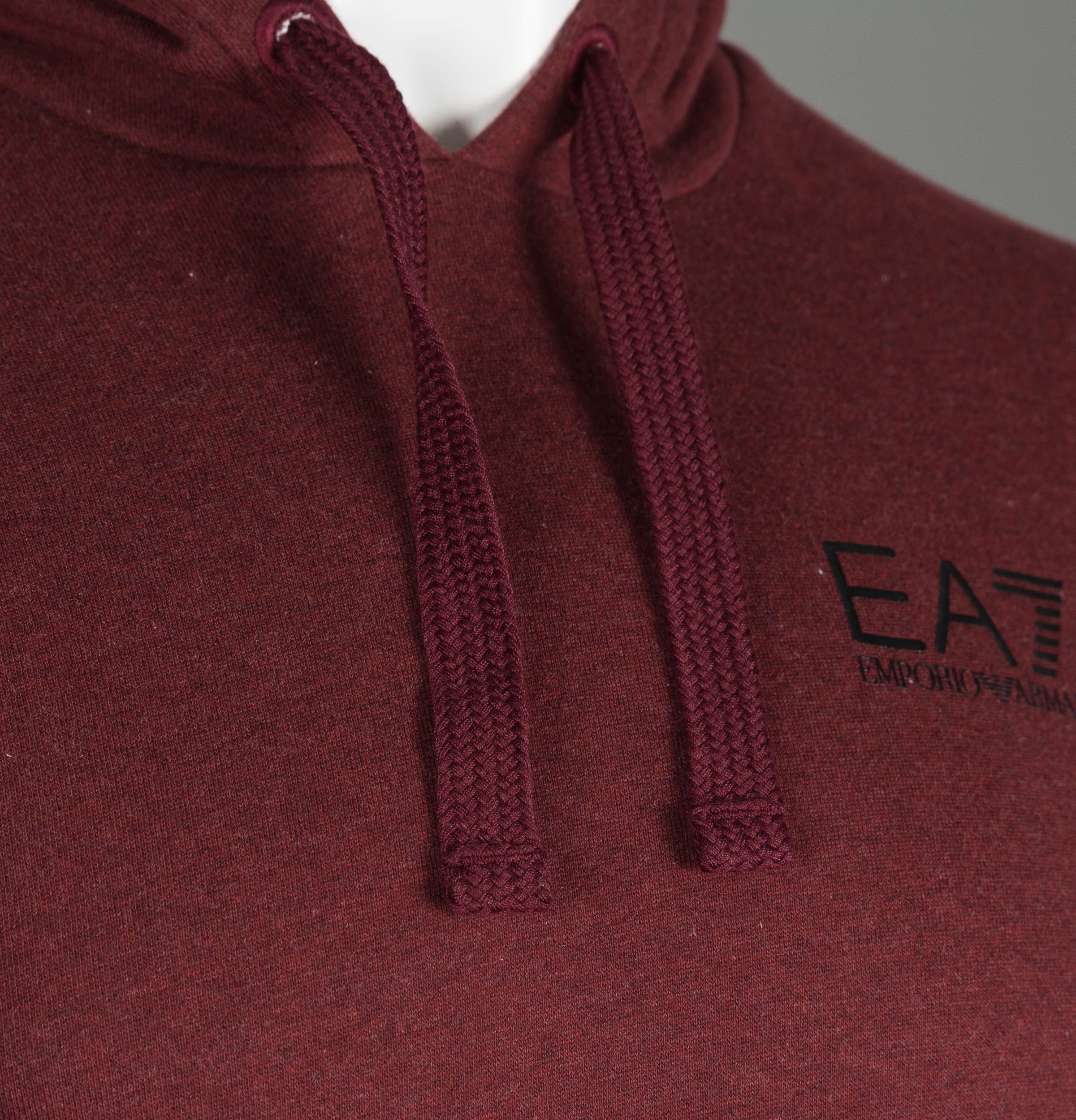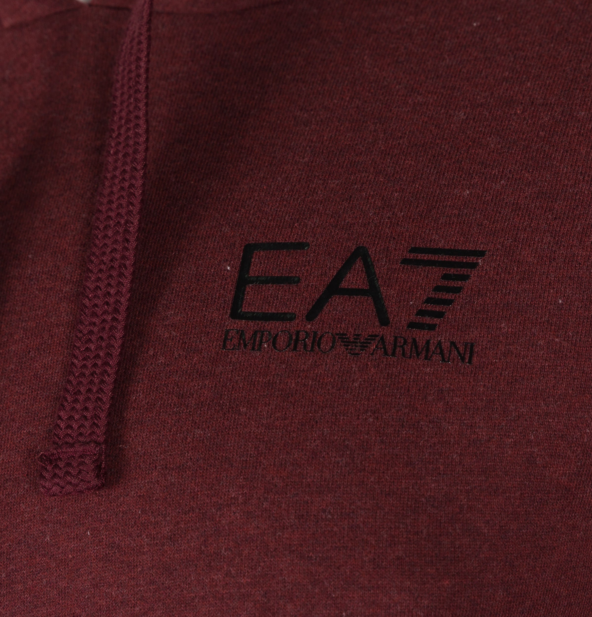 EA7 Emporio Armani hooded sweatshirt. Burgundy Marl soft fleece back cotton. Chunky draw cord hood with embroidered eyelets. Front kangaroo pouch pocket. Black rubber EA7 Emporio Armani logo printed on the chest. Black rubber stripe detail on the lower back. Ribbed sleeve cuffs and hem. Regular fit. 84% cotton, 16% polyester.