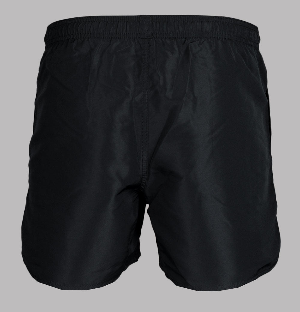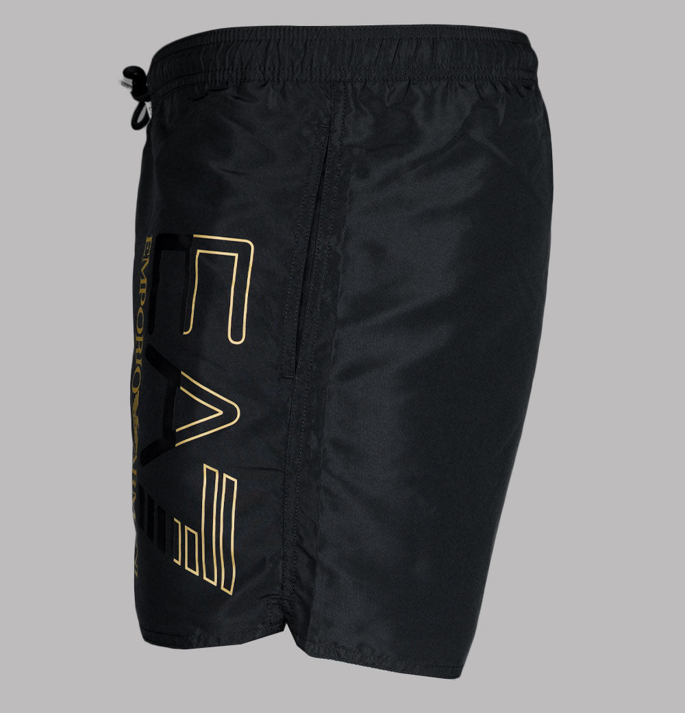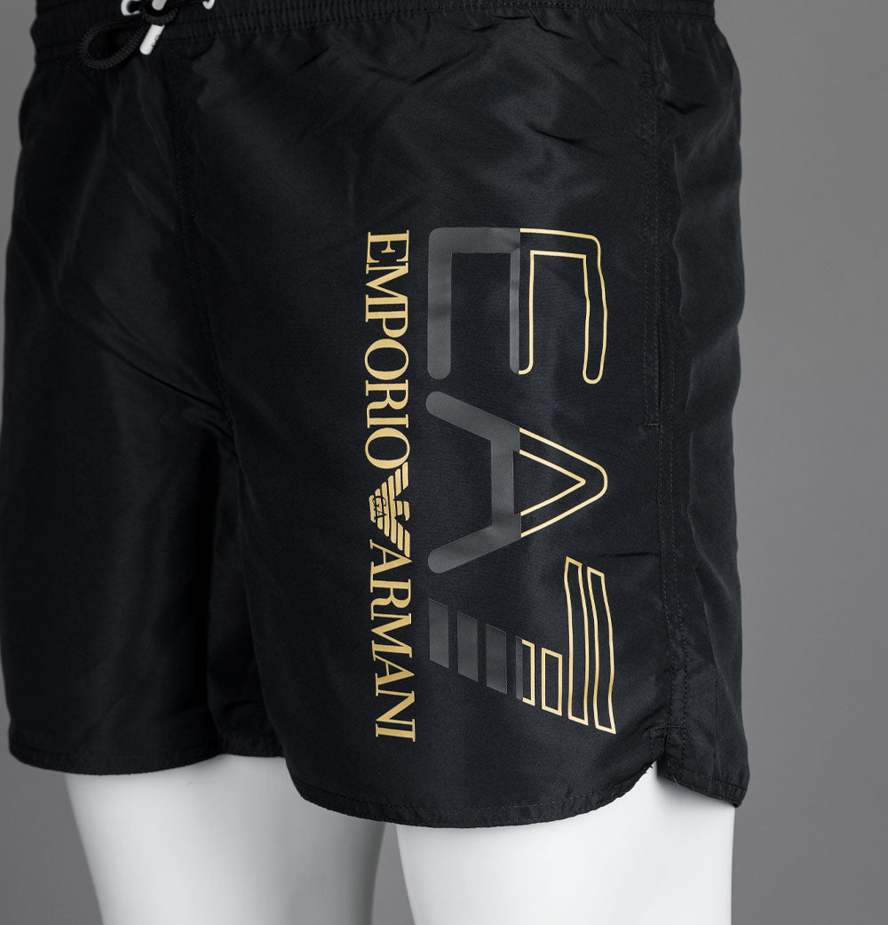 EA7 Emporio Armani Gold series swim shorts. Black lightweight polyester fabric. Adjustable draw cord waistband with White metal eyelets. Two front pockets. Black and Gold EA7 Emporio Armani branding on the leg. Premium mesh lining. Regular fit with a short inseam. 100% polyester.