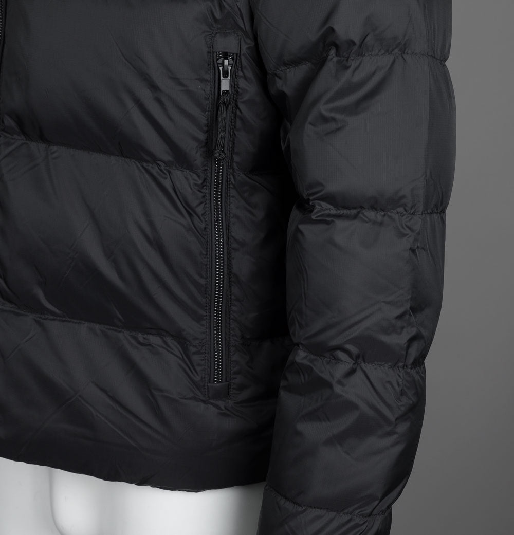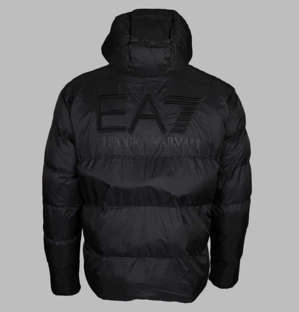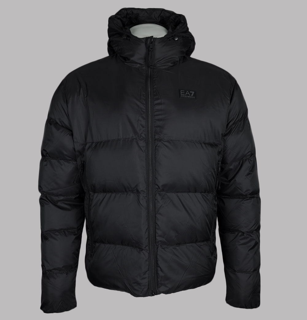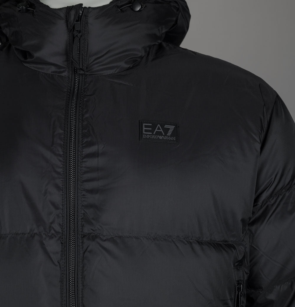 EA7 Emporio Armani Mountain polar padded jacket in Black. Premium polyester fabric with lightweight padding. Two way front zip up fastening. Bungee cord adjustable hood. Large front zip pockets. Rubber EA7 Emporio Armani badge on the chest. Large Embroidered EA7 Emporio Armani logo on the back. Elasticated sleeve cuffs. Slim fit. 100% polyester.
