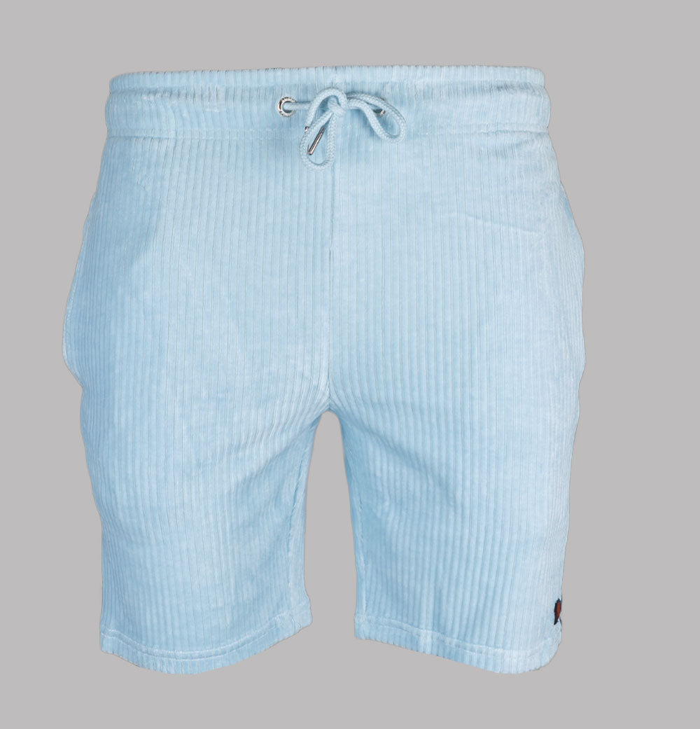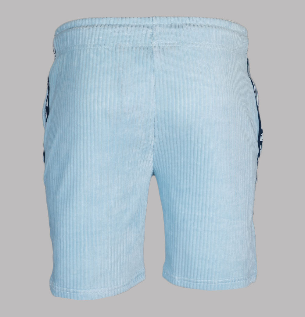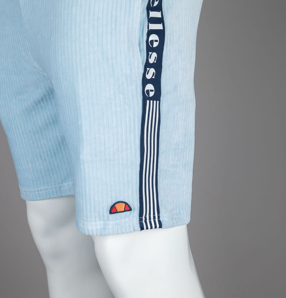 Ellesse Tomatro jumbo cord shorts in Light Blue. Cotton/polyester blend fabric. Adjustable draw cord waist band. Front pockets. Woven Ellesse branded taping on the sides with stripe detail. Embroidered Ellesse badge. Regular fit. 65% cotton, 33% polyester, 2% elastane.