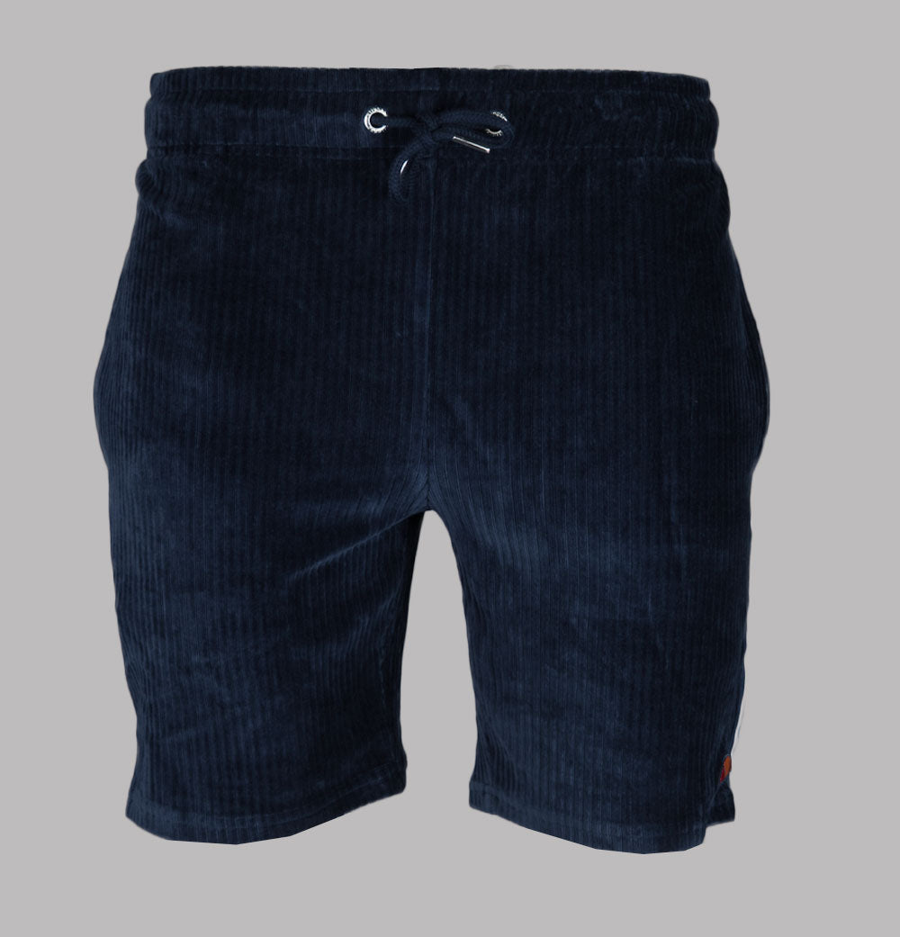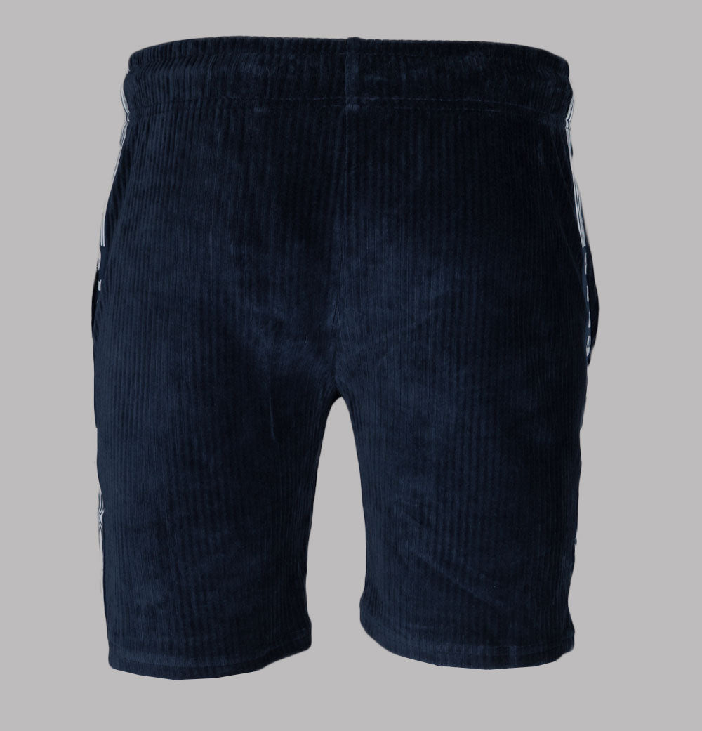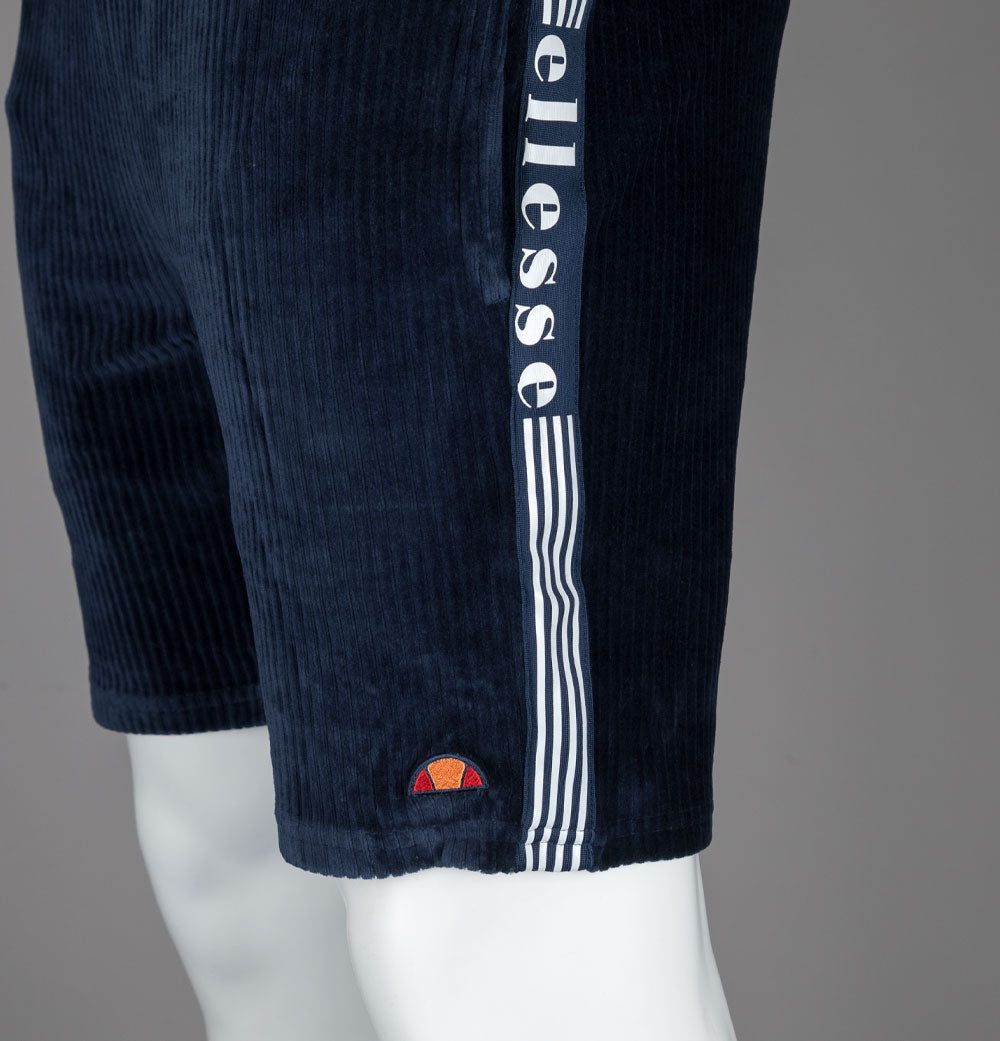 Ellesse Tomatro jumbo cord shorts in Navy. Cotton/polyester blend fabric. Adjustable draw cord waist band. Front pockets. Woven Ellesse branded taping on the sides with stripe detail. Embroidered Ellesse badge. Regular fit. 65% cotton, 33% polyester, 2% elastane.