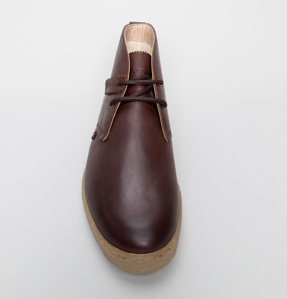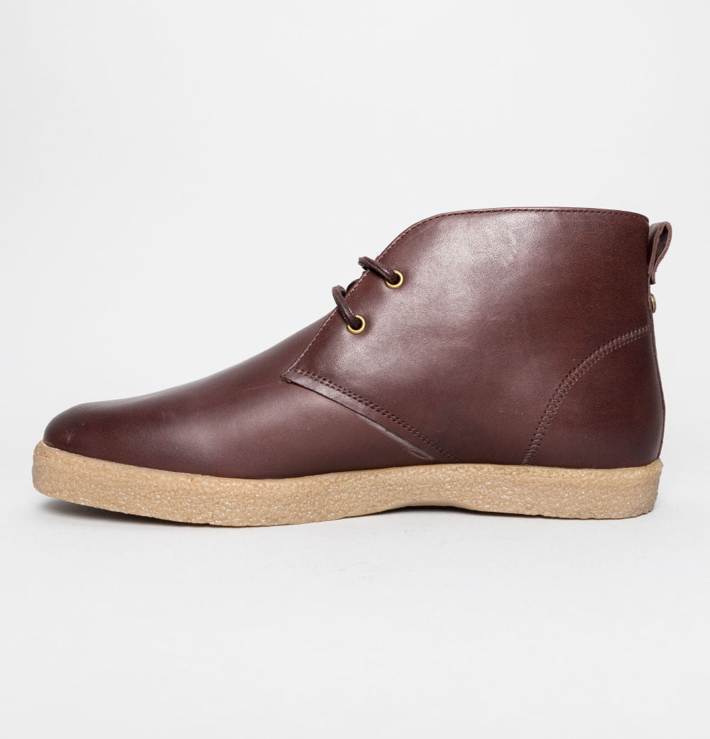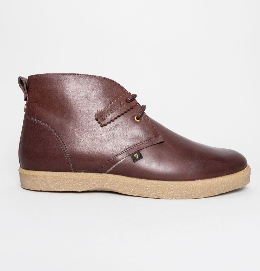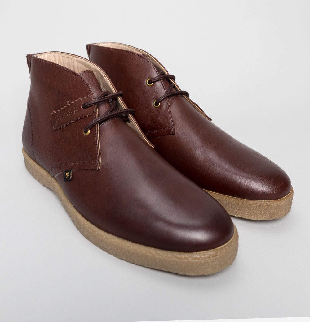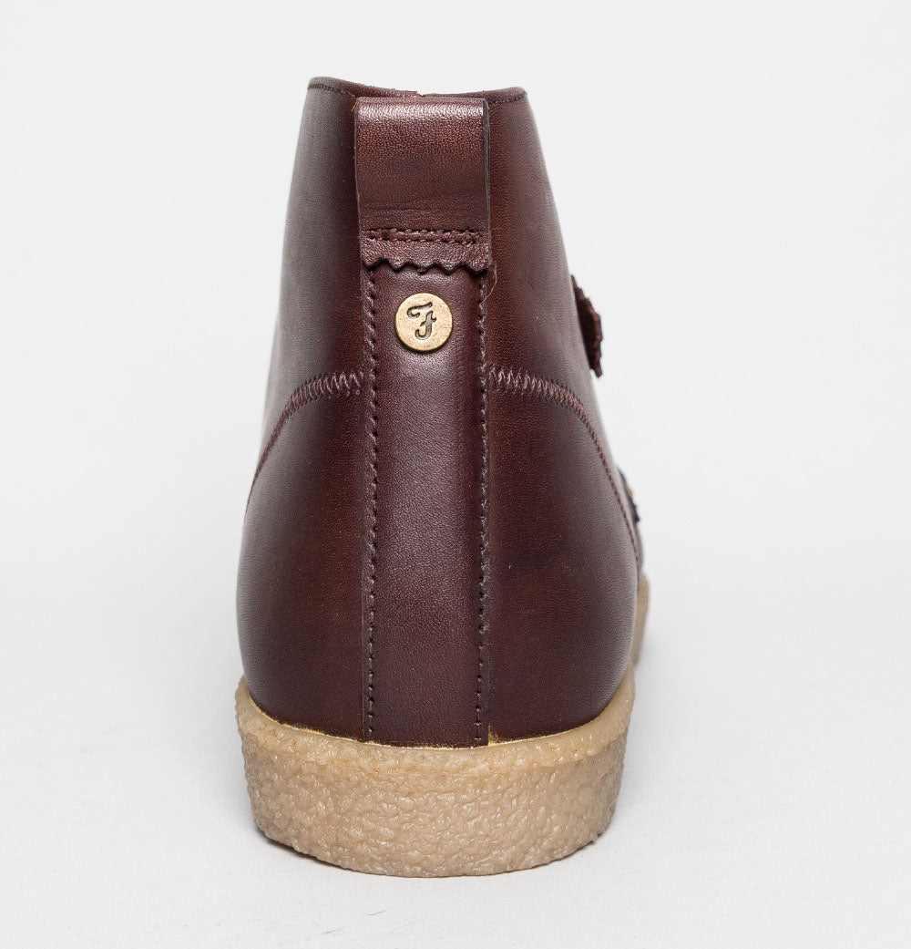 Farah Jonah Leather mid ankle boots. Brown premium leather uppers. Lace up fronts with rounded laces. Small Farah branded metal badge on the back. Small embossed Farah tag on the side. Tonal stitch detail. Chunky rubber sole unit. All UK standard sizes.