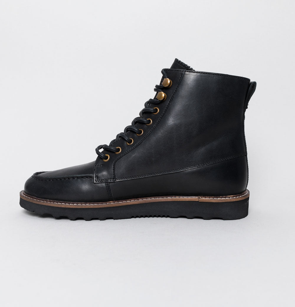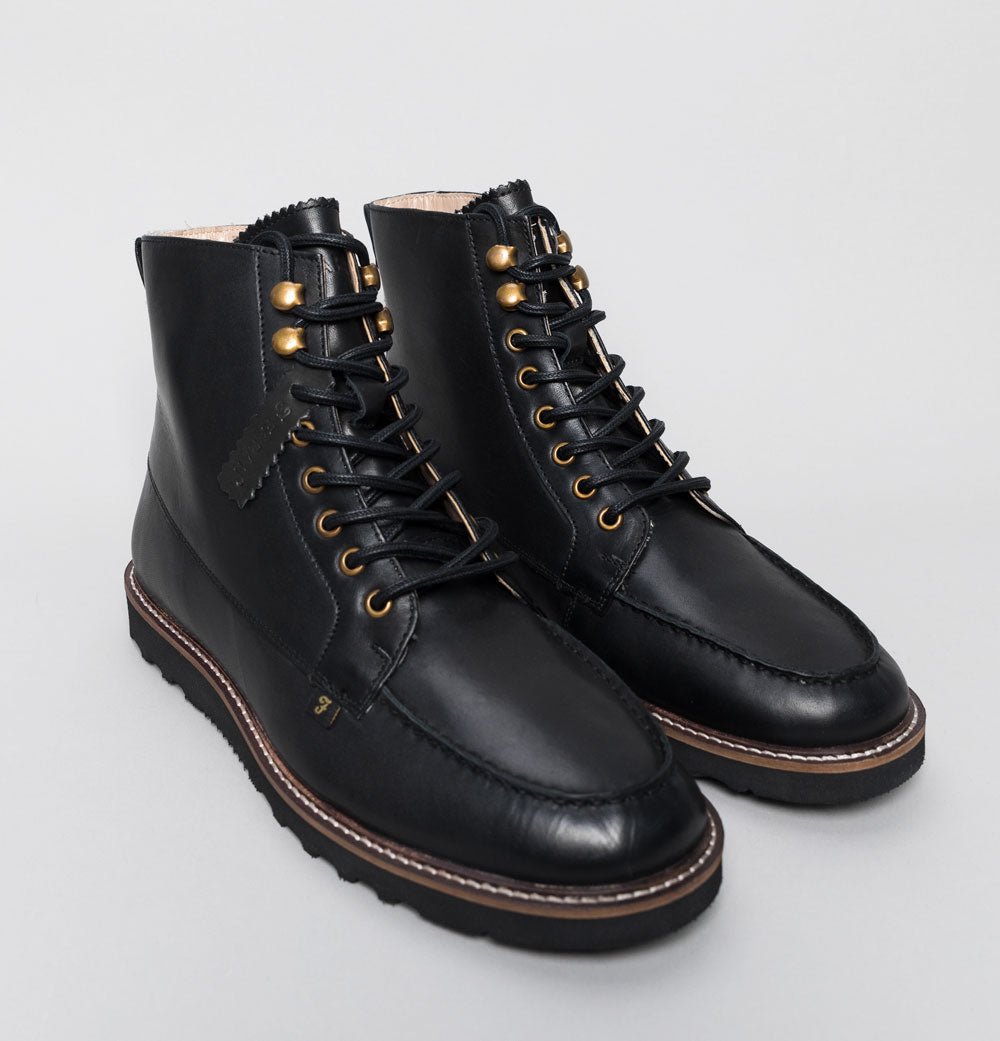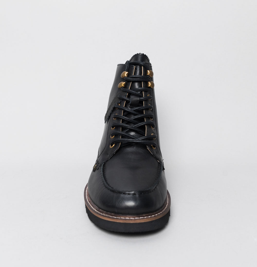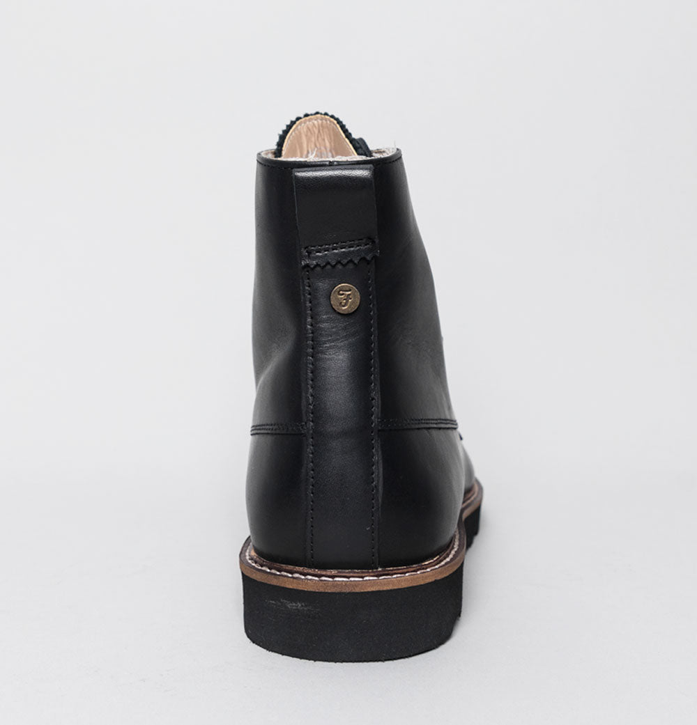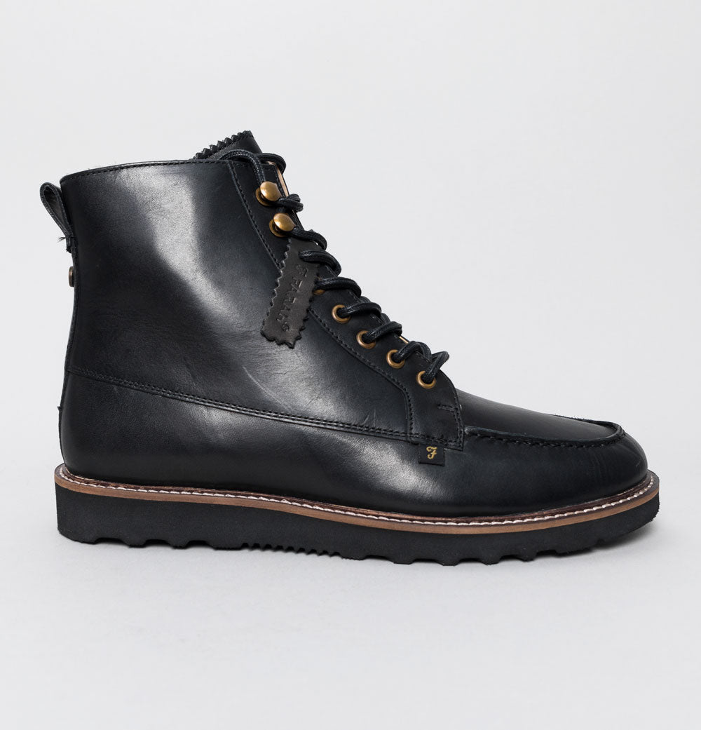 Farah Pantego Leather ankle boots in Black. Soft vintage leather. Full lace up fronts. Small embroidered Farah tag on the sides. Small metal Farah badge on the back of the ankle. Chunky grip soles. Embossed Farah logo on the tongue. Stitch detail. All UK standard sizes.