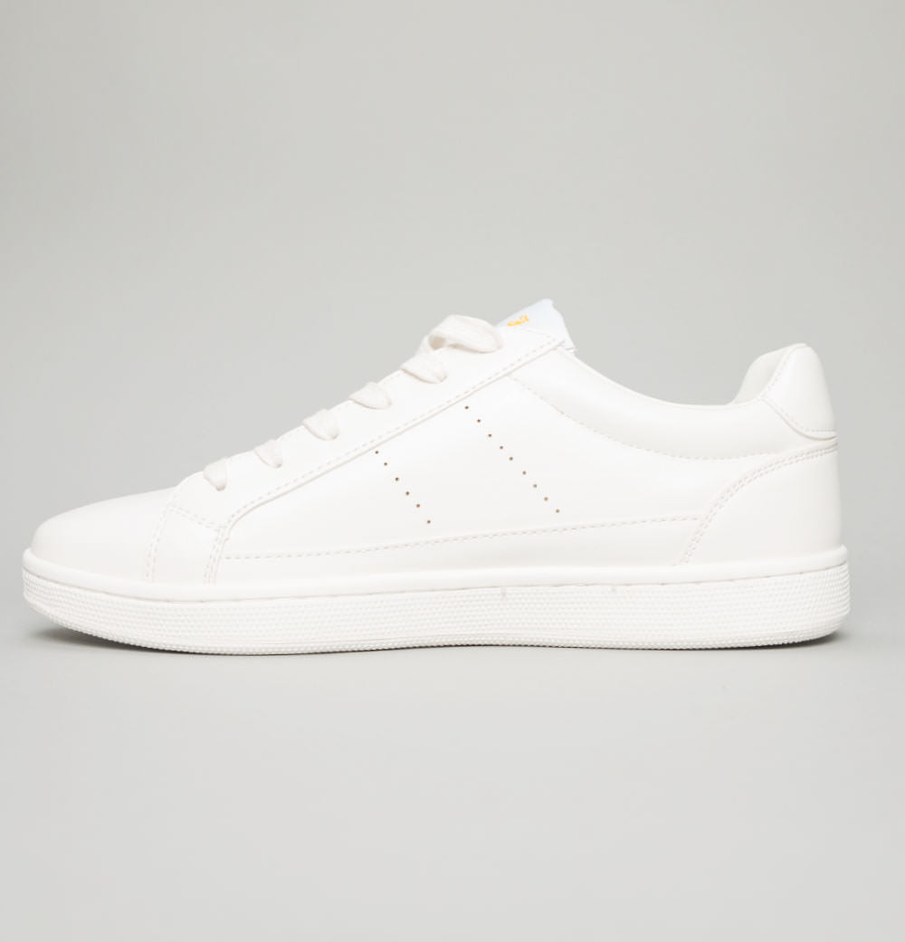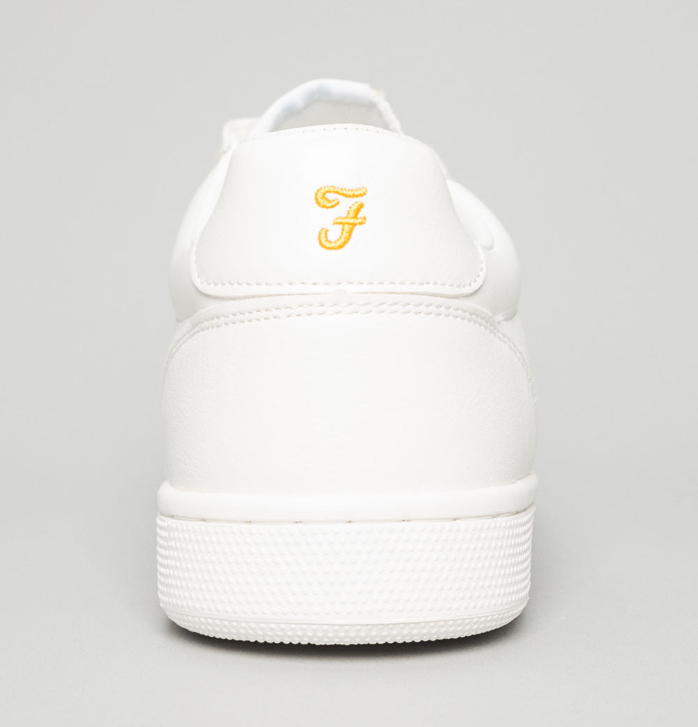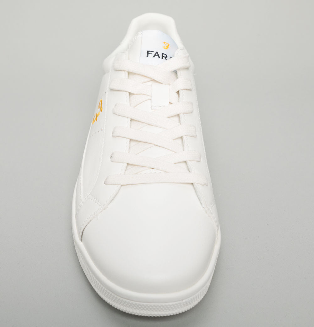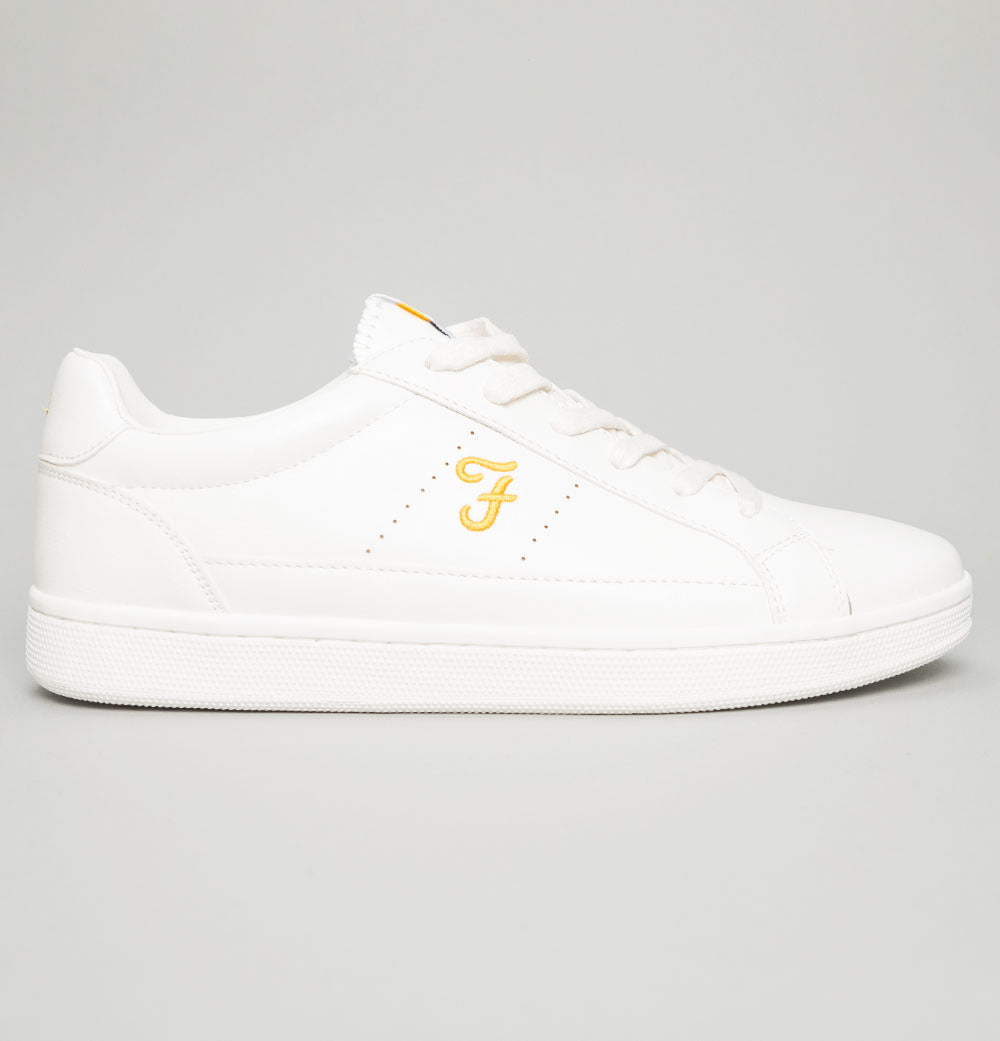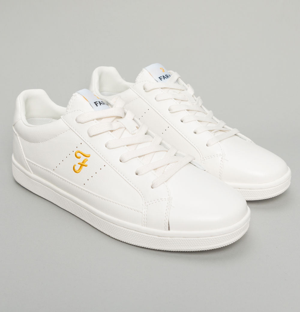 Farah Samwood cupsole trainers. White PU uppers with tonal stitch detail. Lace up fronts. Embroidered Farah logo on the heel tab. Embroidered Farah logo on the sides. Signature Farah branding on the tongue. White rubber soles. Canvas lined insoles. All UK standard sizes.