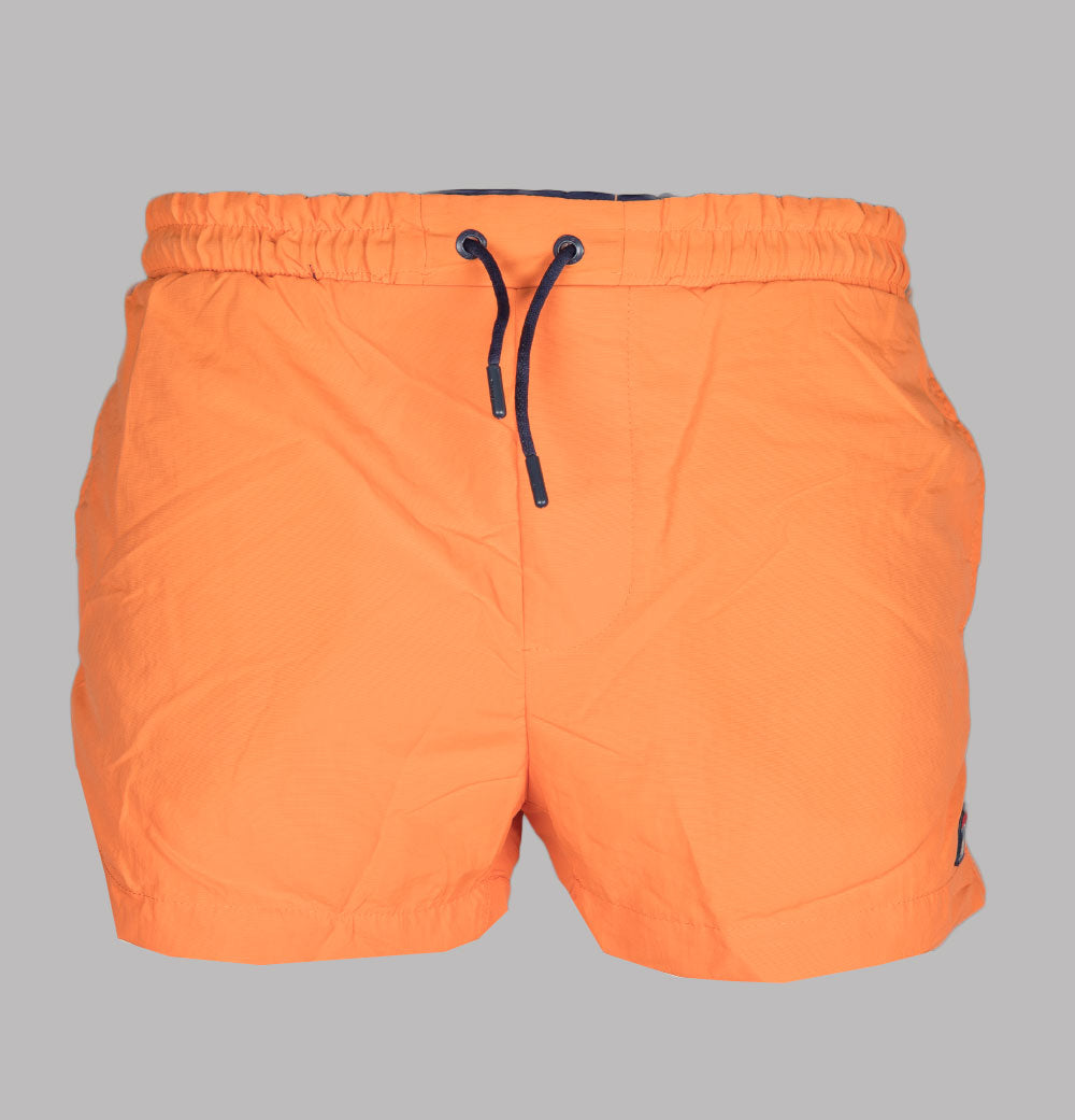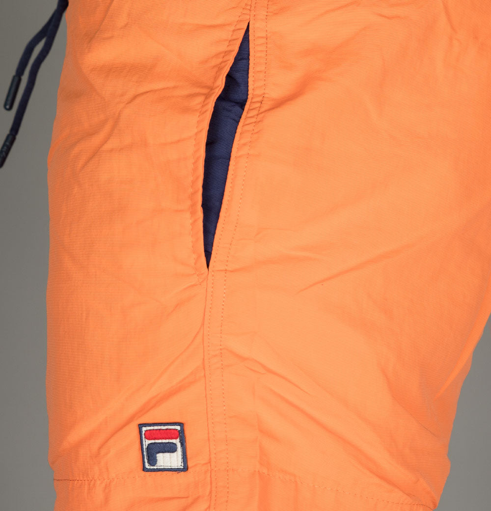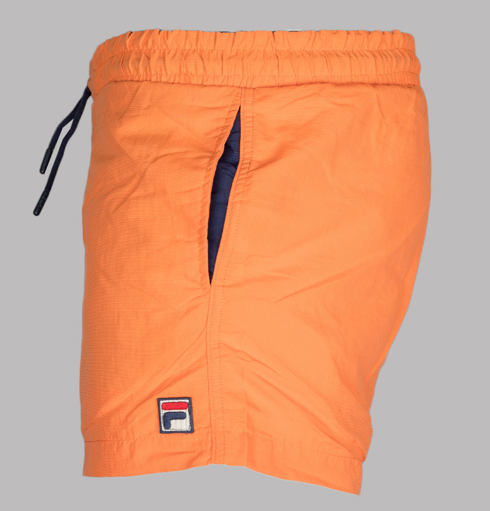 Fila Vintage Artoni swim shorts. Orange lightweight nylon fabric. Drawstring elastic waistband with colour contrast metal eyelets. Two front pockets and one back pocket. Fila box logo embroidered on the left thigh. Navy Blue trim detail. Fully mesh lined. Regular fit waist with a short inseam. 100% nylon.