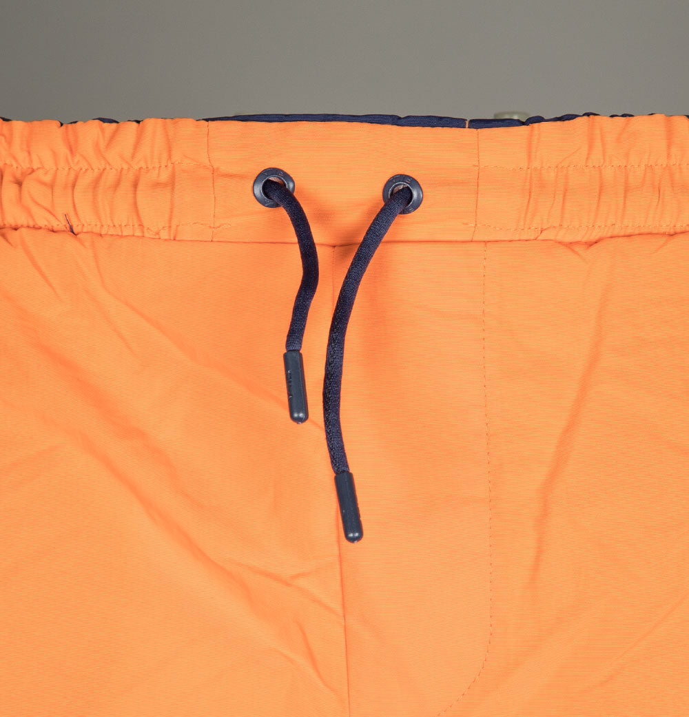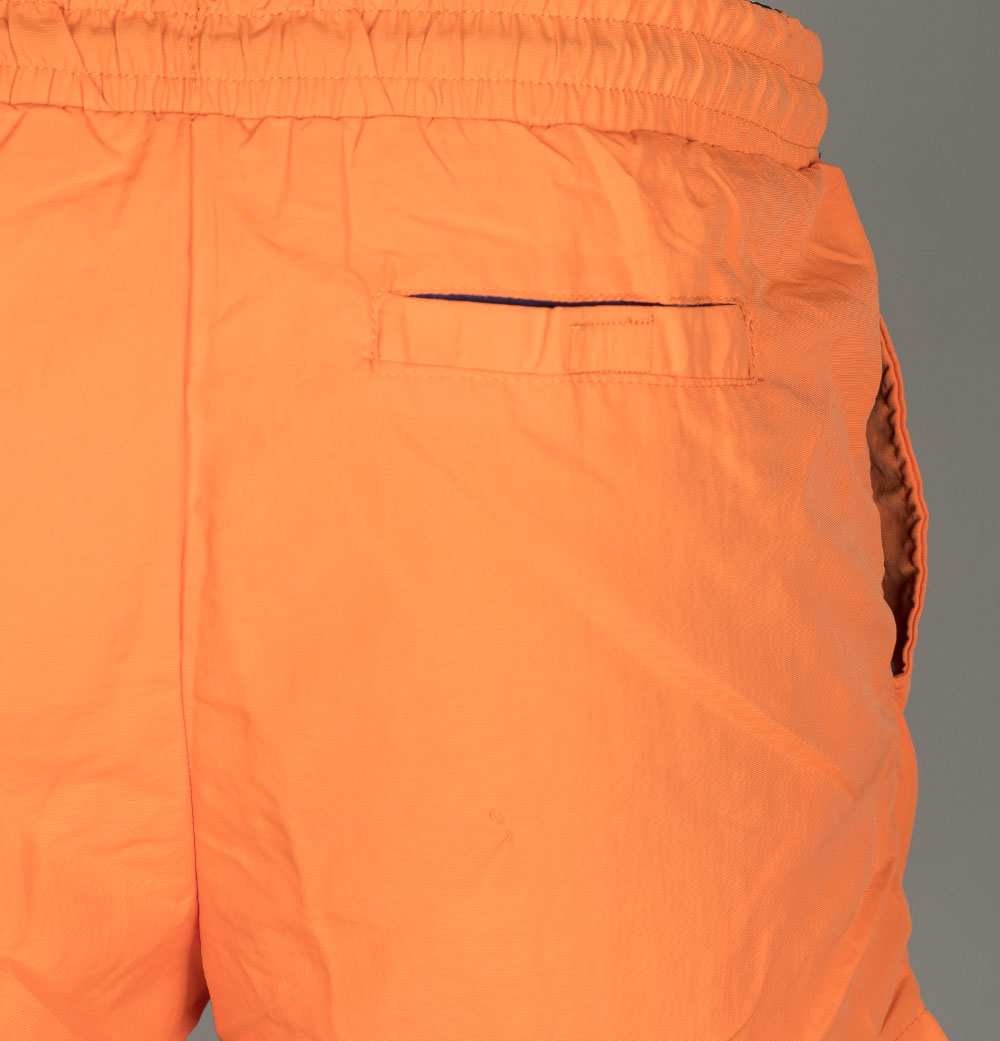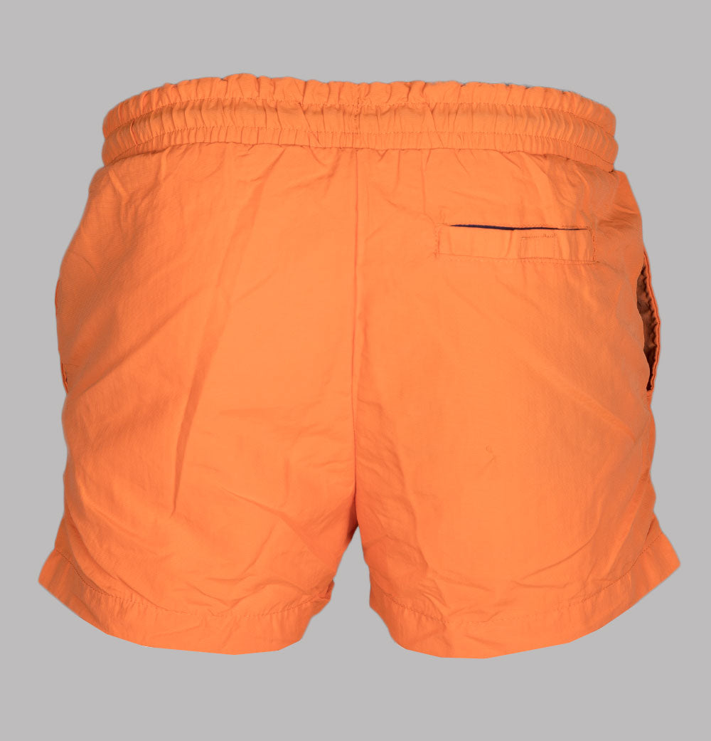 Fila Vintage Artoni swim shorts. Orange lightweight nylon fabric. Drawstring elastic waistband with colour contrast metal eyelets. Two front pockets and one back pocket. Fila box logo embroidered on the left thigh. Navy Blue trim detail. Fully mesh lined. Regular fit waist with a short inseam. 100% nylon.