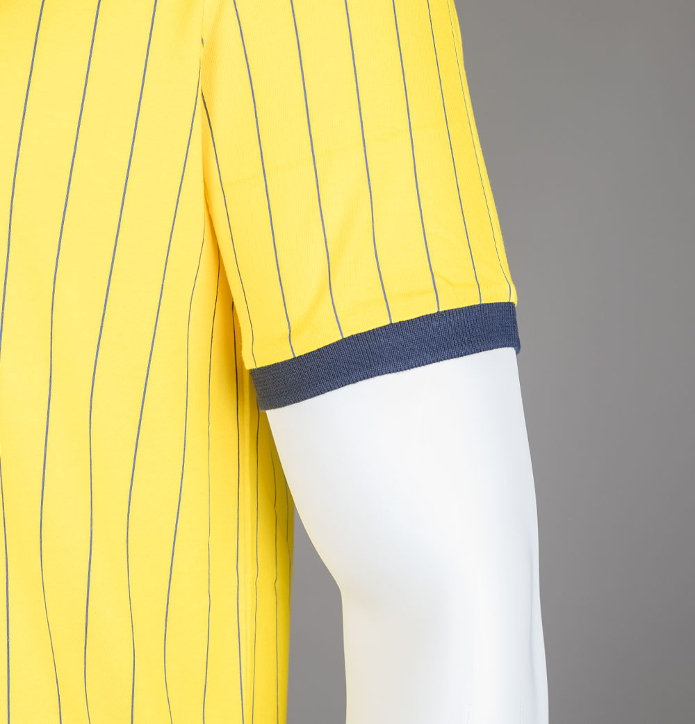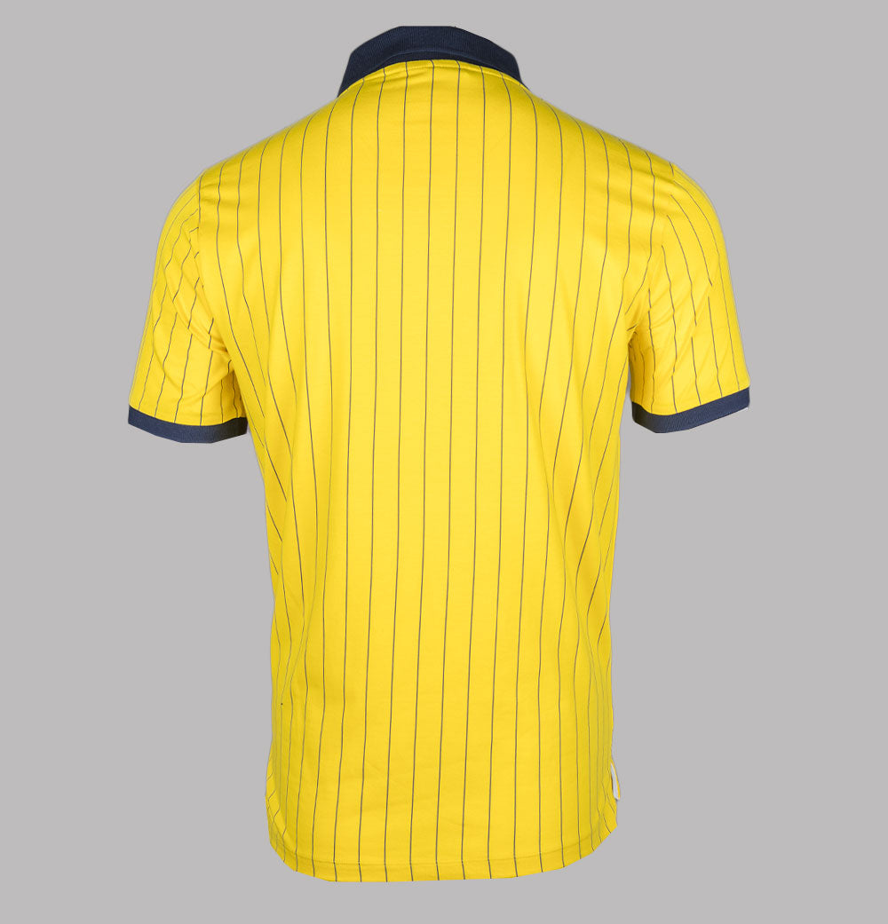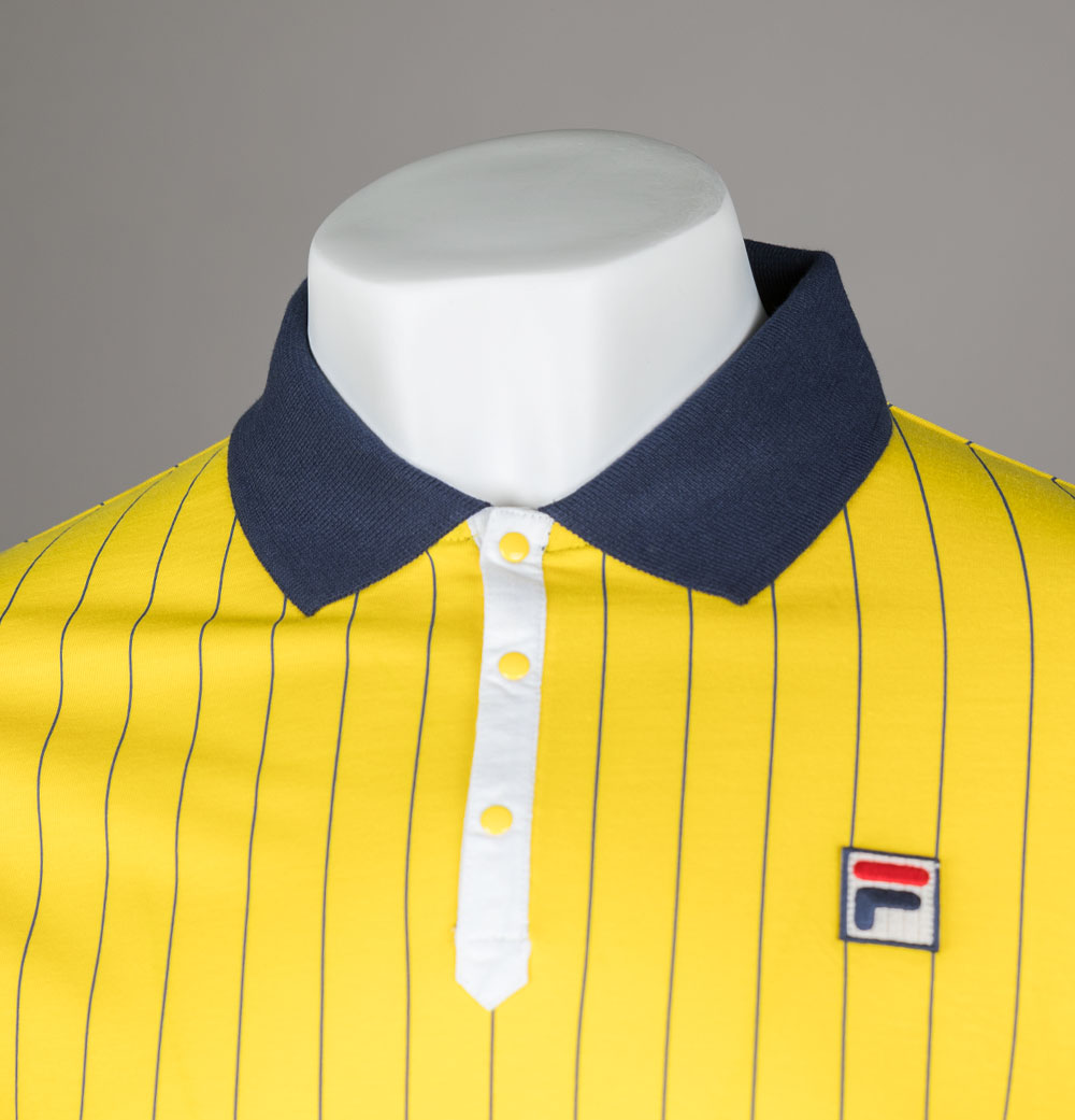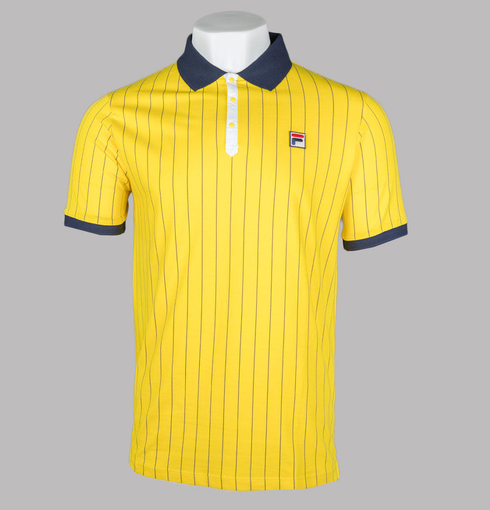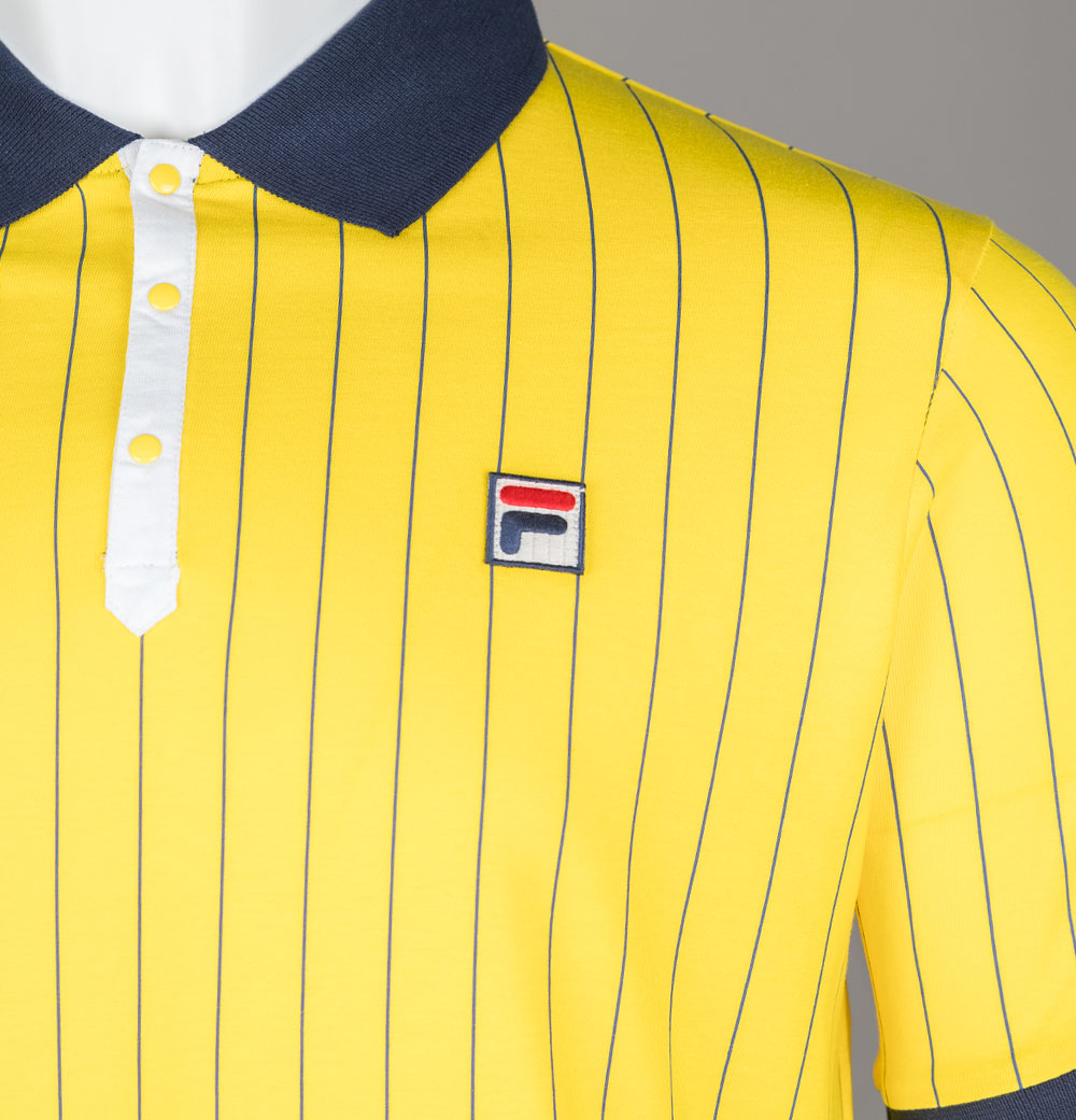 Fila Vintage BB1 classic striped short sleeve polo shirt. High Visability Yellow cotton jersey fabric. Fila Navy finely ribbed collar and arm cuffs. All over pin stripe design. White three snap button placket. Embroidered Fila box logo on the chest. Side slit detail on the hem. Regular fit. 100% cotton