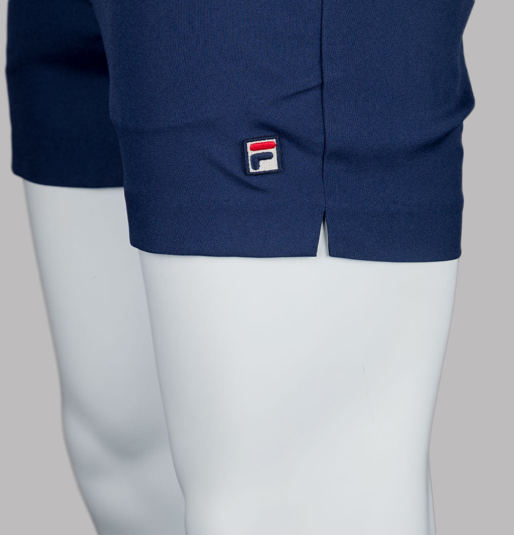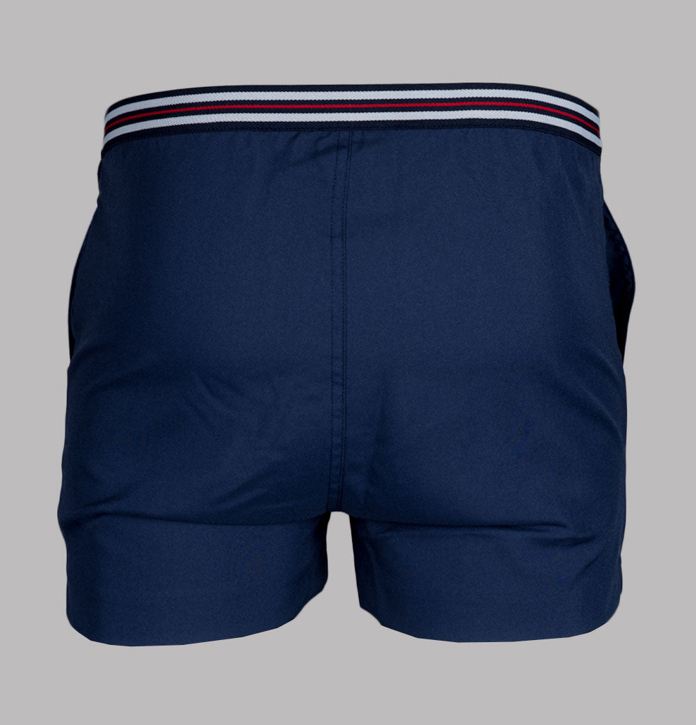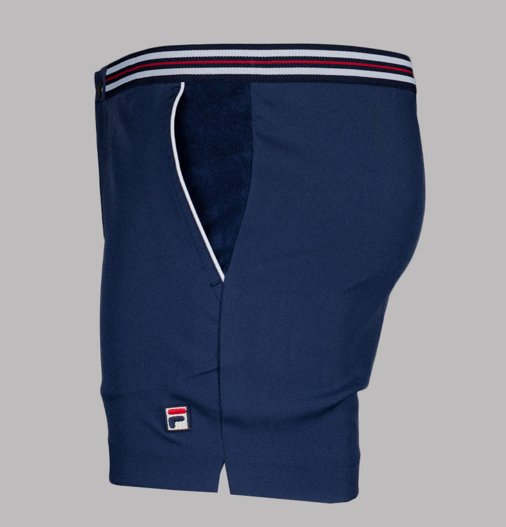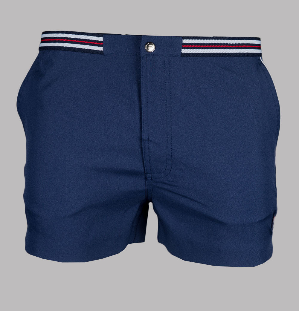 Fila Vintage Hightide 4 shorts in Fila Navy/Gardenia. Soft polyester weave fabric. Striped elasticated waistband. Zip fly with press stud and velcro closure. Two side pockets with towelling detail. Embroidered Fila box logo on the thigh. Side slits. Slim fitting with a short inseam. 100% polyester.