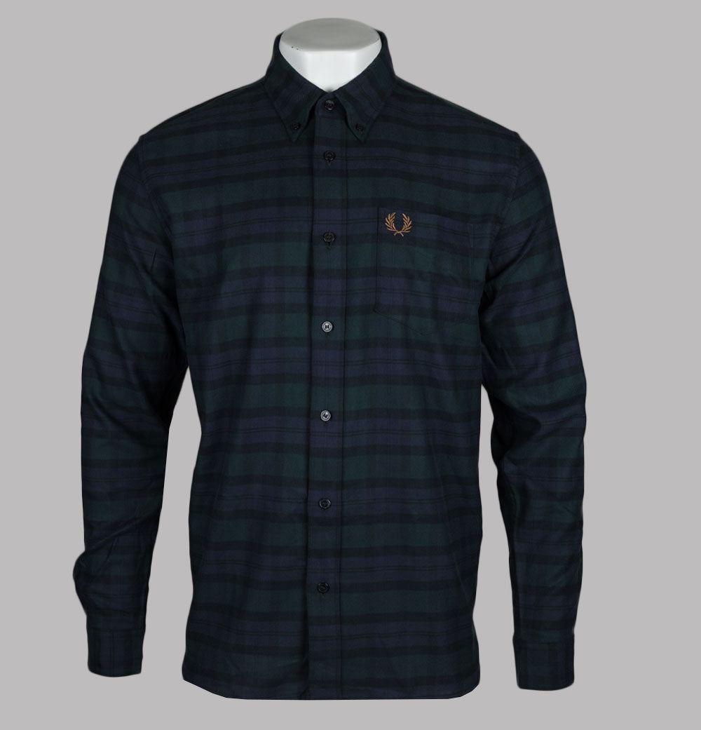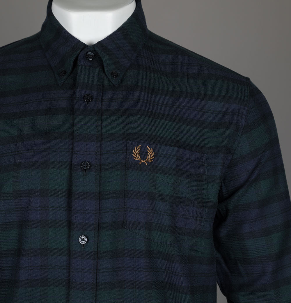 Fred Perry long sleeve brushed Black Watch Tartan shirt. Brushed premium cotton fabric. Classic button down collar. Single chest pocket with embroidered Laurel Wreath. Single button sleeve cuffs. Regular fit. 100% cotton.